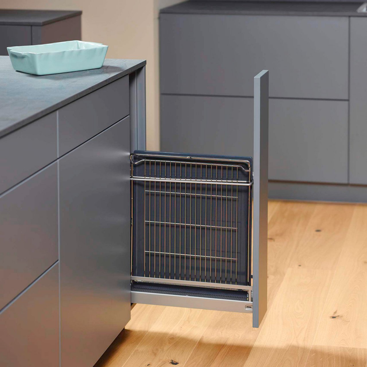 Det lille skapet er optimalt for oppbevaring av for eksempel stekeplater, krydder eller håndklær og skapsuttrekket passer for 15 cm brede skap.Uttrekket er utstyrt med Softstopp, som gir en myk og stille lukking.