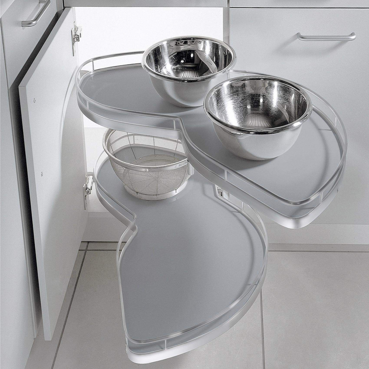 Det smarte hjørneskaputtrekket Le Mans II fra Kesseböhmer kombinerer elegant design og funksjonalitet. Med en åpningsvinkel på 85° optimaliseres lagringsplassen i skapet.