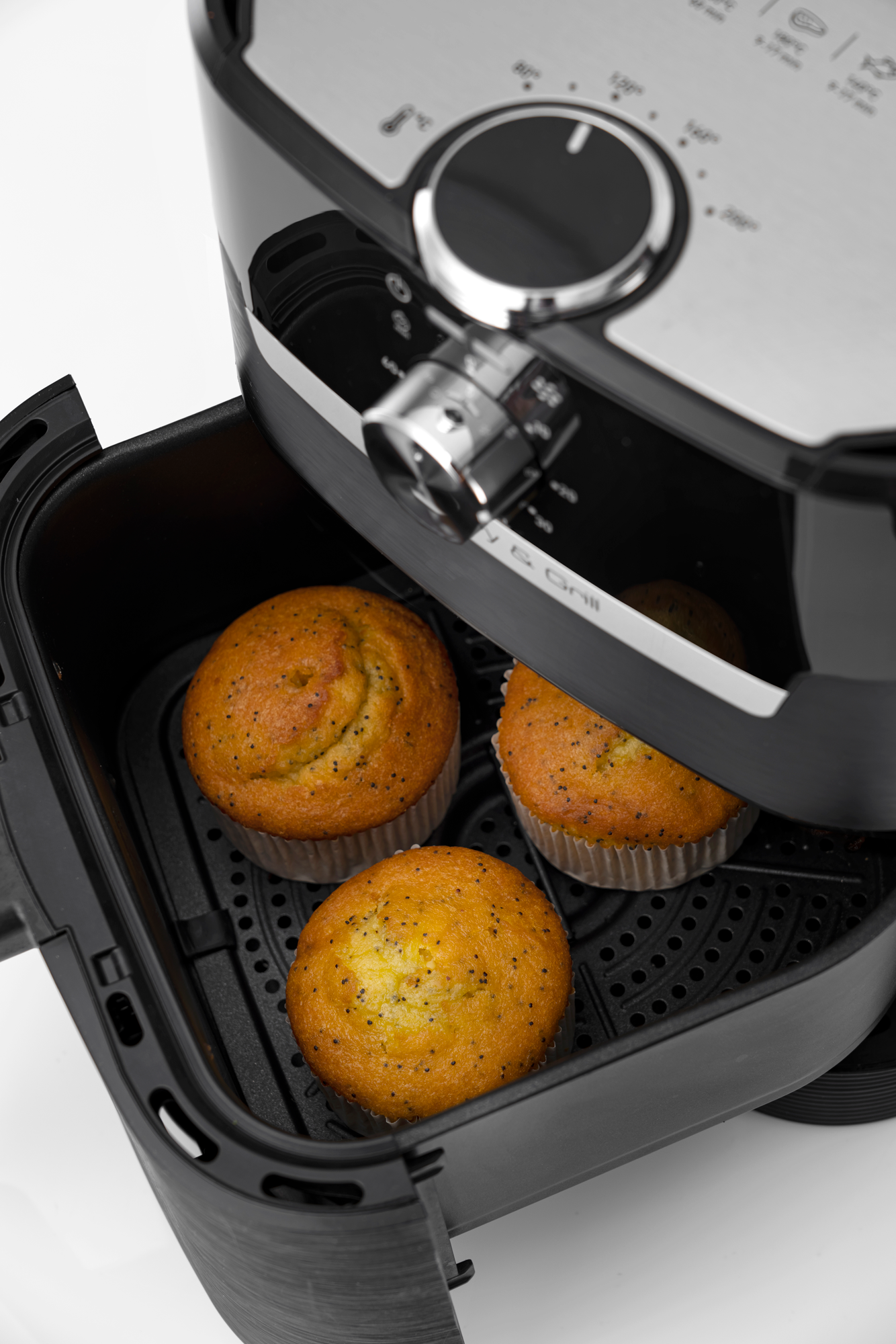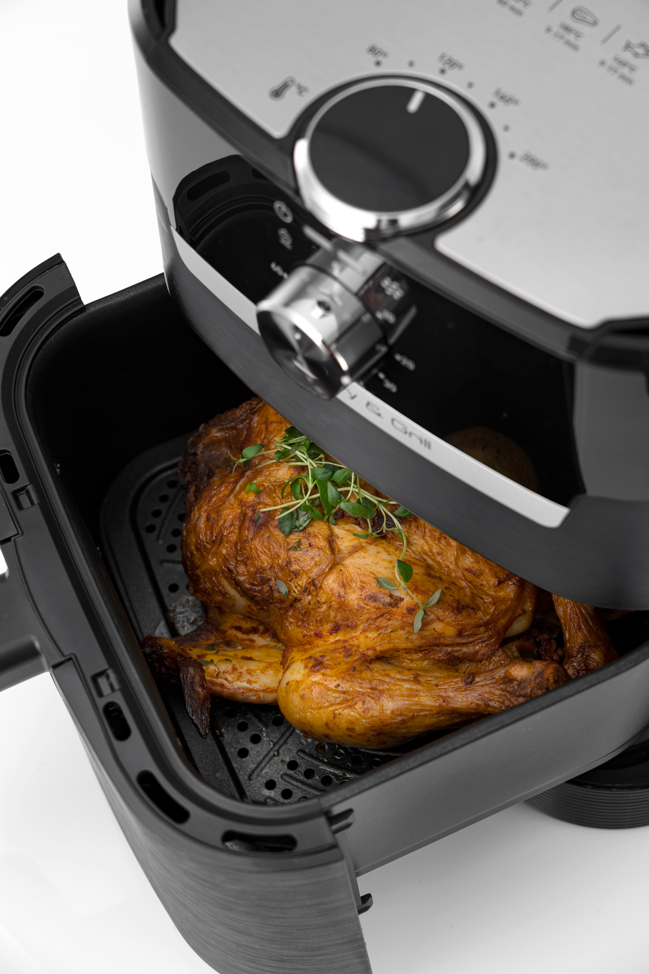 Luftfrityrkokeren har en stor kapasitet, som gjør det mulig å tilberede mat til opptil seks personer. Den kan brukes til blant annet kylling, pommes frites, grønnsaker og mer, og kommer også med en grill-funksjon og grilltilbehør. Temperaturen kan justeres fra 80 til 200°C, og denne varmen fordeles jevnt. Varmluften sirkulerer i høy hastighet, for en perfekt stekeskorpe.