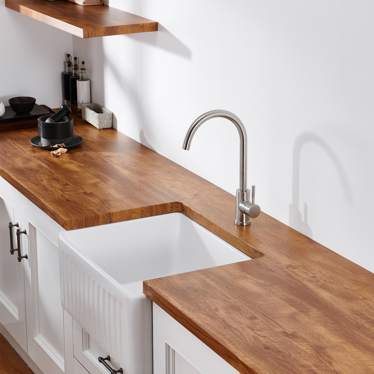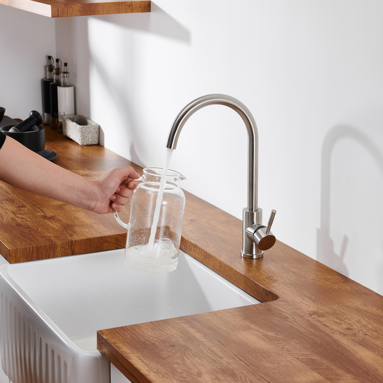 Bradford fra Celeste er et stilrent kjøkkenarmatur . Den C-formede tuten og 360° svingradius gir god utnyttelse av kjøkkenservanten, og gjør det enkelt å vaske blant annet store panner og kar.
