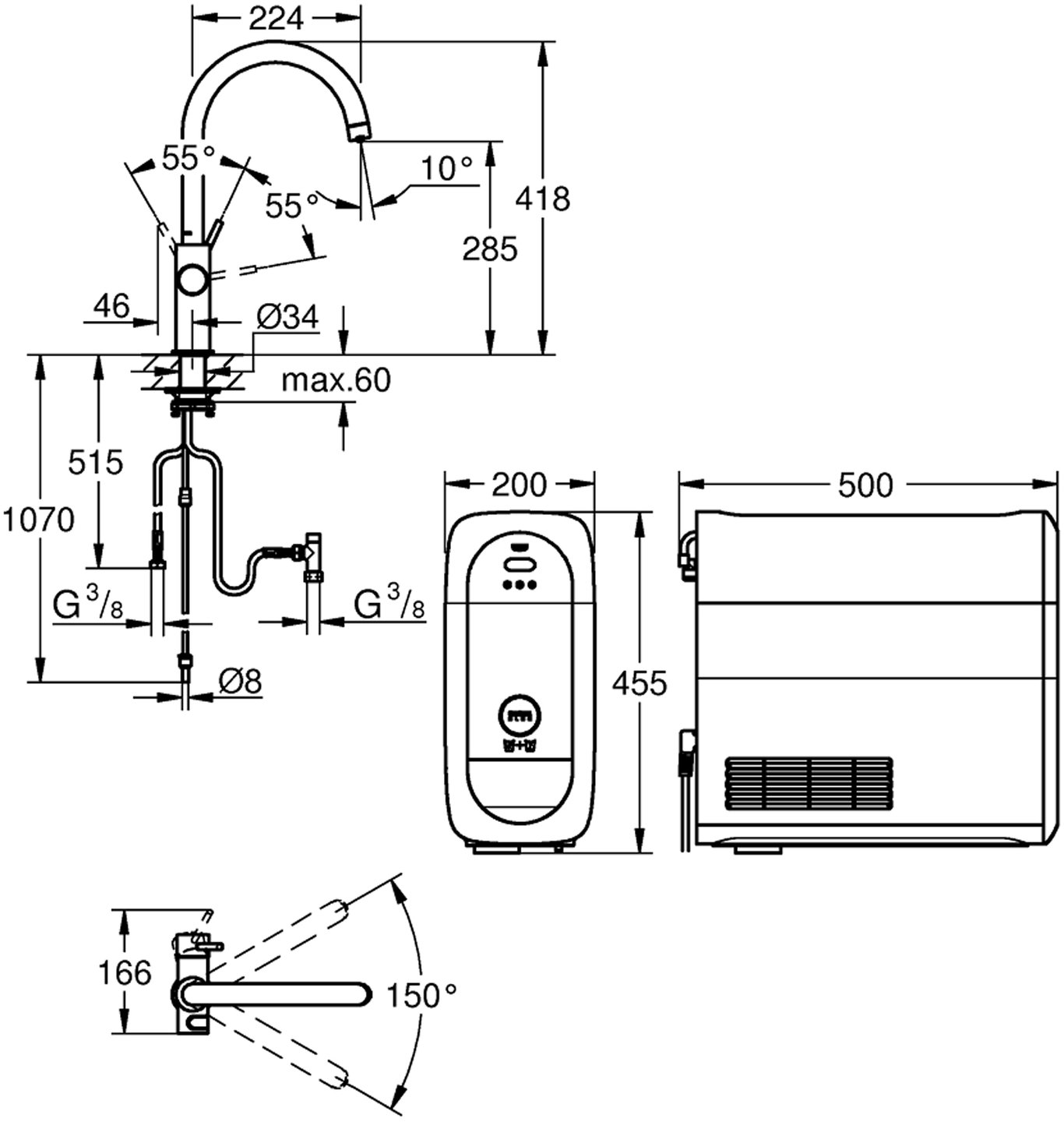 består av:GROHE Blue Home ettgrepsbatteri med rensefilteretthullsmontasjeC-tuttrykknapper for 3 typer filtrert og avkjølt vannstille, medium, musserendeGROHE StarLight-overflateGROHE SilkMove 28 mm keramisk patronsvingbar rørtutsvingfelt 150°separate vannveier for filtrertog ikke-filtrert vannfleksible tilkoblingsslangerGROHE Blue Home kjølerleverer 3 liter kaldt vann per time180 Watt kjøleenhet, 230 V, 50 Hzlydnivå ved standby 44 dB(A)type av beskyttlese IP 21CE-nummerKrever ventilasjonshull i bunnen av kjøkkenskapetProgramvareoppsett og overvåking av filter og CO<sub>2</sub> kapasitet mulig via GROHE Ondus appmed Bluetooth 4.0* og WIFI-grensesnitt for trådløs datakommunikasjonfor Apple** og Android enheterBluetooth rekkevidde (max. 10 m) varierer avhengig av debrukte materialene og vegger mellom avsender og mottakerjusterbar for GROHE Blue filtrer størrelse S, GROHE Blue aktivert karbon filter og GROHE Blue magnesium + filterGROHE Blue filter str. S, filter, hode med justerbar vannstyrkefor regioner med vannhardhet på mer enn 9 ° dKHFor regioner med vannhardhet under 9 ° dKH,vennligst bestil vårt karbonfilter 40 547 001GROHE Blue 425 g CO<sub>2</sub> flaskeSystemkrav AppleiPhone med iOS 12.0 eller nyereSystemkrav AndroidSmarttelefon med Android 6.0 eller nyereMobilenheter og GROHE Watersystems App*** er ikke inkludert i leveransen og må bestilles/installeres separat via en autorisert Apple-forhandler/Apple Store/iTunes eller Google Play Store.* Bluetooth merket og logo er registrerte varemerker som eies av Bluetooth SIG, Inc. og all bruk av dette varemerket av Grohe AG er under lisens. Andre varemerker og enheter er under respektive eiere.** Apple, Apple logoen, iPod, iPod Touch, iPhone og iTunes er varemerker under Apple Inc., registrert i USA og andre land. Apple er ikke ansvarlig for funksjonen til denne enheten eller overholdelsen av sikkerhets- og forskriftsstandarder.*** Tilgjengelig grats i iTunes eller i Google Play store.Dette produktet inneholder stoffer som er erklært som et farlig stoff. Finn mer informasjon i sikkerhetsdatabladet. Du kan laste ned sikkerhetsdataene på: www.grohe.com/safety-data-sheets/Vann- og avløpsinstallasjoner må installeres av rørlegger.