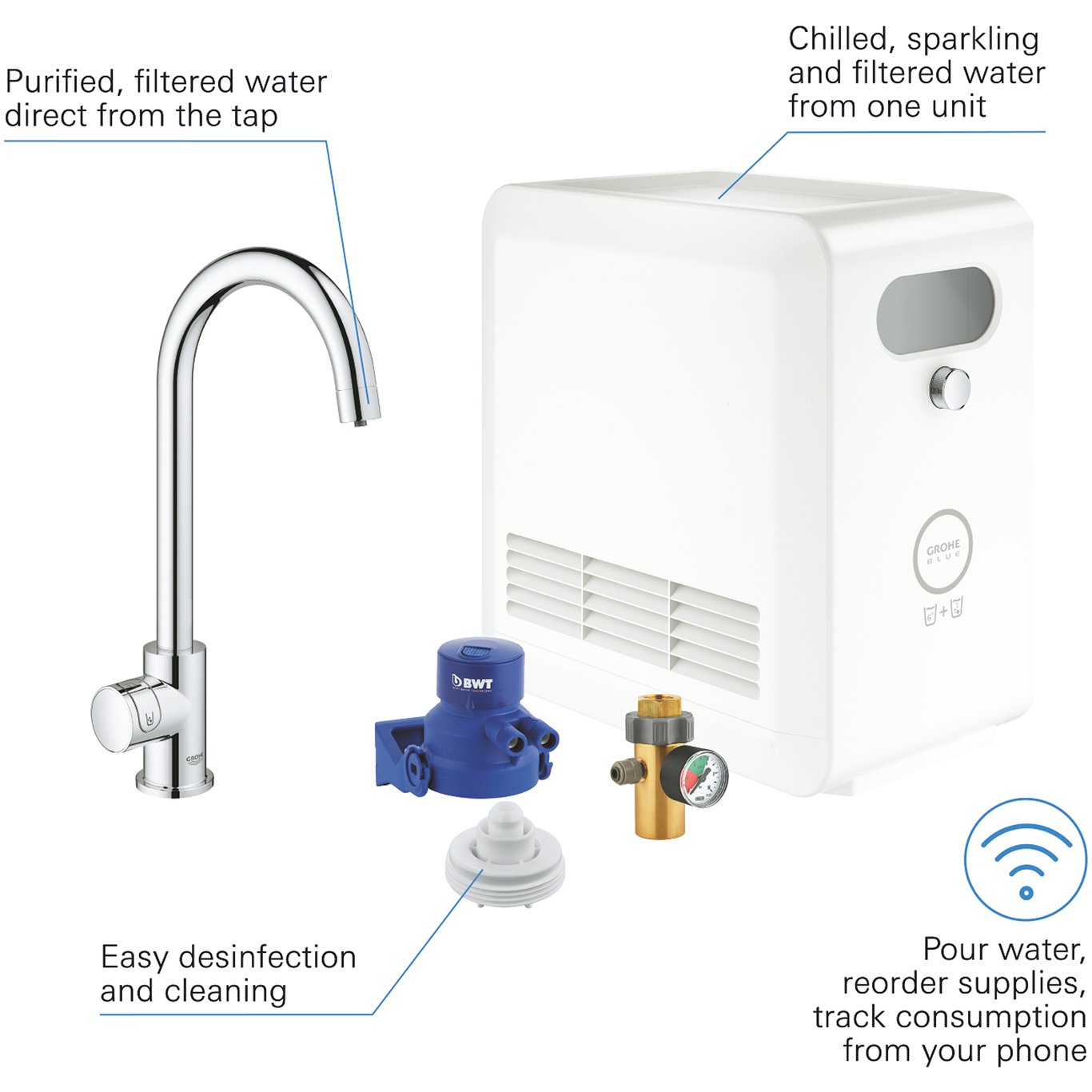 består av:GROHE Blue Mono faucet with filter functionetthullsmontasjeC-tuttrykknapper for 3 typer filtrert og avkjølt vannstille, medium, musserendeGROHE Long-Life Shine overflatesvingbar rørtutsvingfelt 150°GROHE Blue Professional kjølerleverer 12 liter nedkjølt vann med kullsyre per timefargedisplay med trykk og vri kontroll270 watts kjøleenhet, 230 V, 50 Hzlydnivå i standby 46 dB(A)type av beskyttlese IP 21CE-nummerKrever ventilasjonshull i bunnen av kjøkkenskapetProgramvareoppsett og overvåking av filter og CO<sub>2</sub> kapasitet mulig via GROHE Ondus apppushvarsel ved lav filter resp. CO<sub>2</sub>-kapasitetekstra overvåking via GROHE Blue Professional Browser-Monitor muligmed Bluetooth 4.0* og WIFI-grensesnitt for trådløs datakommunikasjonfor Apple** og Android enheterBluetooth rekkevidde (max. 10 m) varierer avhengig av debrukte materialene og vegger mellom avsender og mottakerfilterhodet med fleksibel vannhardhetsjusteringGROHE Blue filter, CO<sub>2</sub>-flaske og rengjøringspatron er ikke inkludert i leveransen og må bestilles separatPassende filtere:- filter S-str., kapasitet 600 l ved 20° dKH (40 404 001)- filter M-str., kapasitet 1500 l ved 20° dKH (40 430 001)- filter L-str., kapasitet 2500 l ved 20° dKH (40 412 001)- Aktivert karbonfilter, kapasitet 3000 l (40 547 001- Magnesium+ filter, kapasitet 400 l ved 17° dGH (40 691 002)Systemkrav AppleiPhone med iOS 12.0 eller nyereSystemkrav Android: Smarttelefon med Android 6.0 eller nyereMobilenheter og GROHE Watersystems App*** er ikke inkludert i leveransen og må bestilles/installeres separat via en autorisert Apple-forhandler/Apple Store/iTunes eller Google Play Store.* Bluetooth merket og logo er registrerte varemerker som eies av Bluetooth SIG, Inc. og all bruk av dette varemerket av Grohe AG er under lisens. Andre varemerker og enheter er under respektive eiere.** Apple, Apple logoen, iPod, iPod Touch, iPhone og iTunes er varemerker under Apple Inc., registrert i USA og andre land. Apple er ikke ansvarlig for funksjonen til denne enheten eller overholdelsen av sikkerhets- og forskriftsstandarder.*** Tilgjengelig grats i iTunes eller i Google Play store.Vann- og avløpsinstallasjoner må installeres av rørlegger.