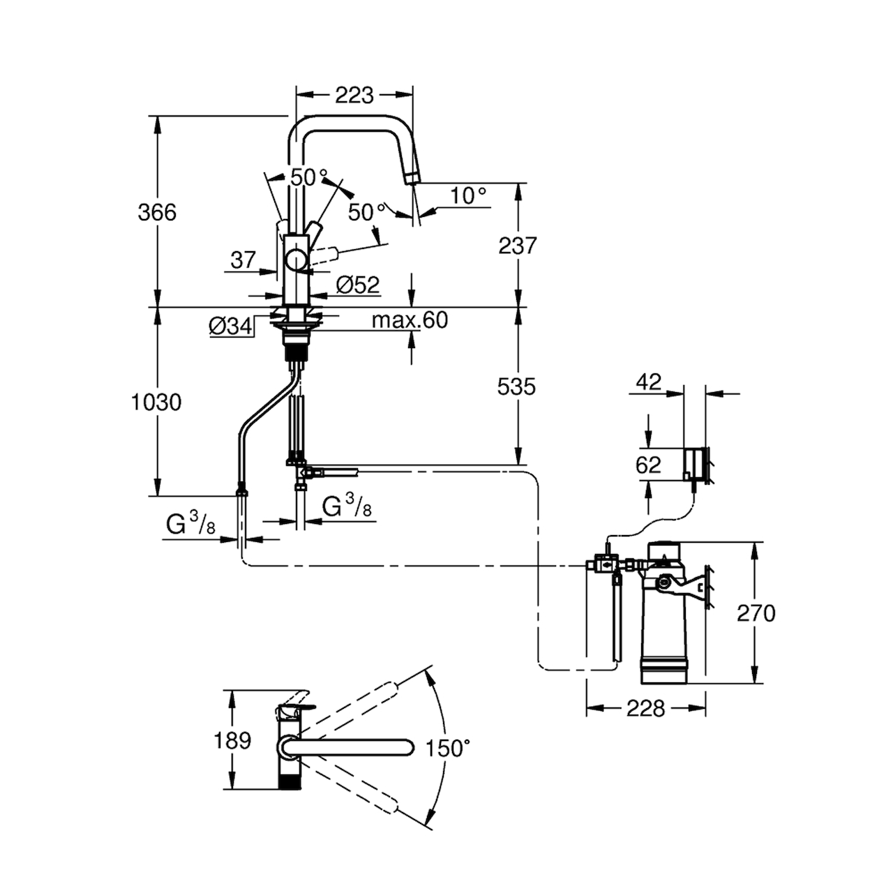 Grohe Blue Pure Start kjøkkenarmatur med vannfilter som filtrerer mikroplast fra drikkevannet, samt reduserer stoffer som er ansvarlig for smak og lukt. Den har separat hendel for filtrert vann, og svingbar rørtut.