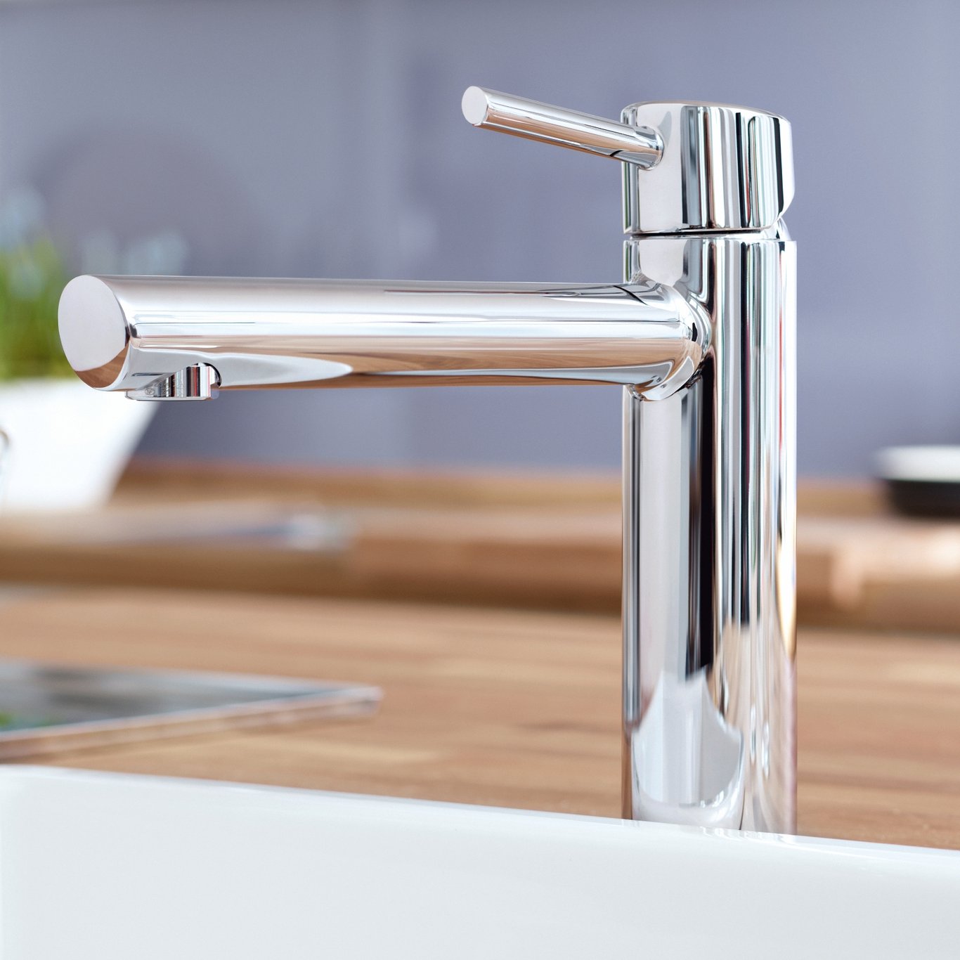 Kjøkkenkranen GROHE Concetto er en perfekt kombinasjon av praktiske egenskaper og attraktiv design. Den leveres med rett, middels høy tut, et godt alternativ til de høye og lave tutene i den samme kolleksjonen, med 140° svingradius. Det er en ideell radius som også sørger for at tuten ikke støter borti skap eller vegger. De keramiske patronene i vår GROHE SilkMove-teknologi gjør det enkelt å justere vannmengde og temperatur, og vårt enkle installasjonssystem sørger for at blandebatteriet kan monteres på et øyeblikk. Den er produsert i samsvar med GROHEs velkjente strenge krav, og den har GROHE StarLight kromfinish som beholder glansen selv etter mange års bruk.