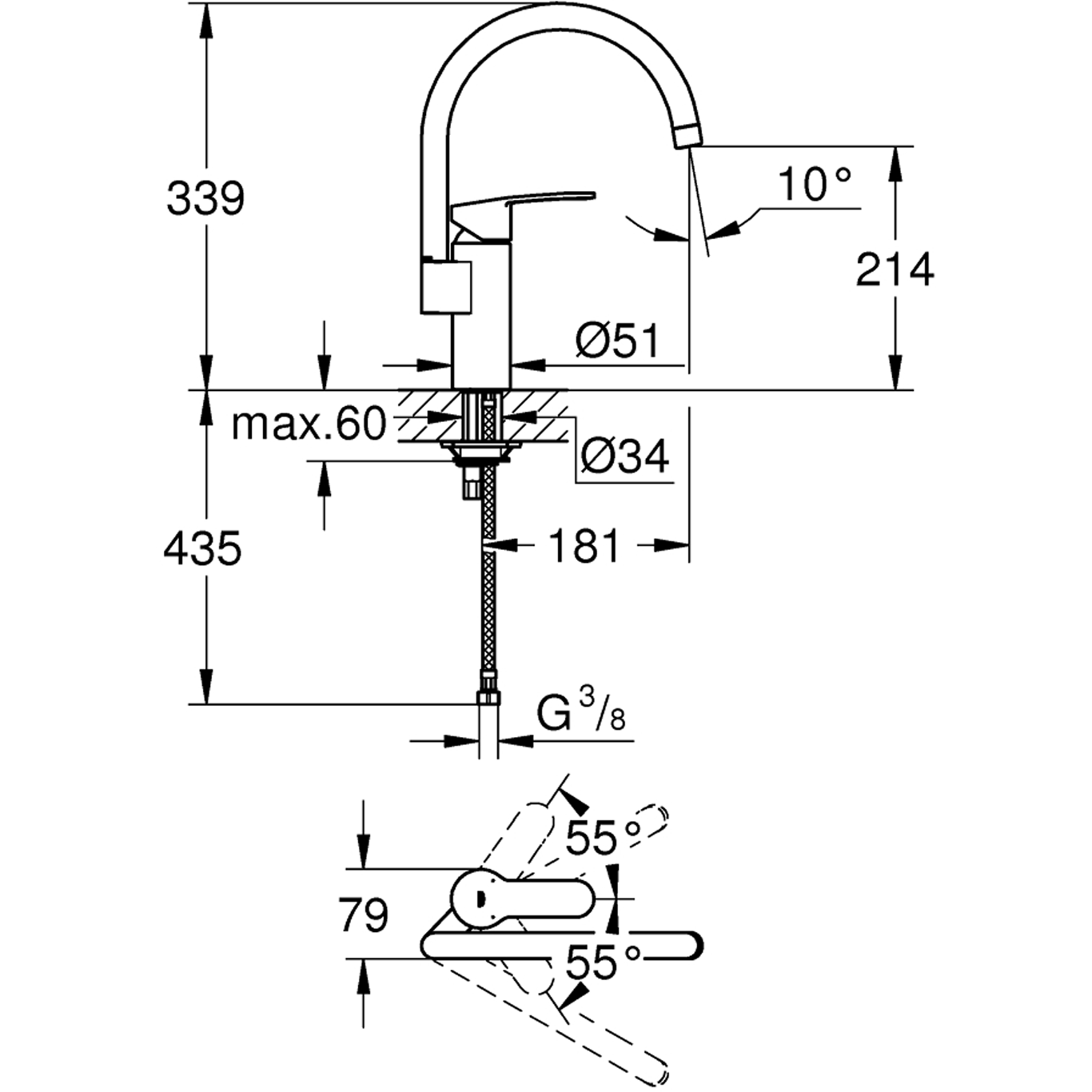 høy tutetthullsmontasjeGROHE Long-Life Shine-overflateGROHE SilkMove 35 mm keramisk Patronperlatorvariable justerbar volumbegrensersvingbar rørtutsvingradius 0° / 150° / 360°fleksible tilkoblingsslangerrask installasjonintegrert temperaturbegrenserVann- og avløpsinstallasjoner må installeres av rørlegger.