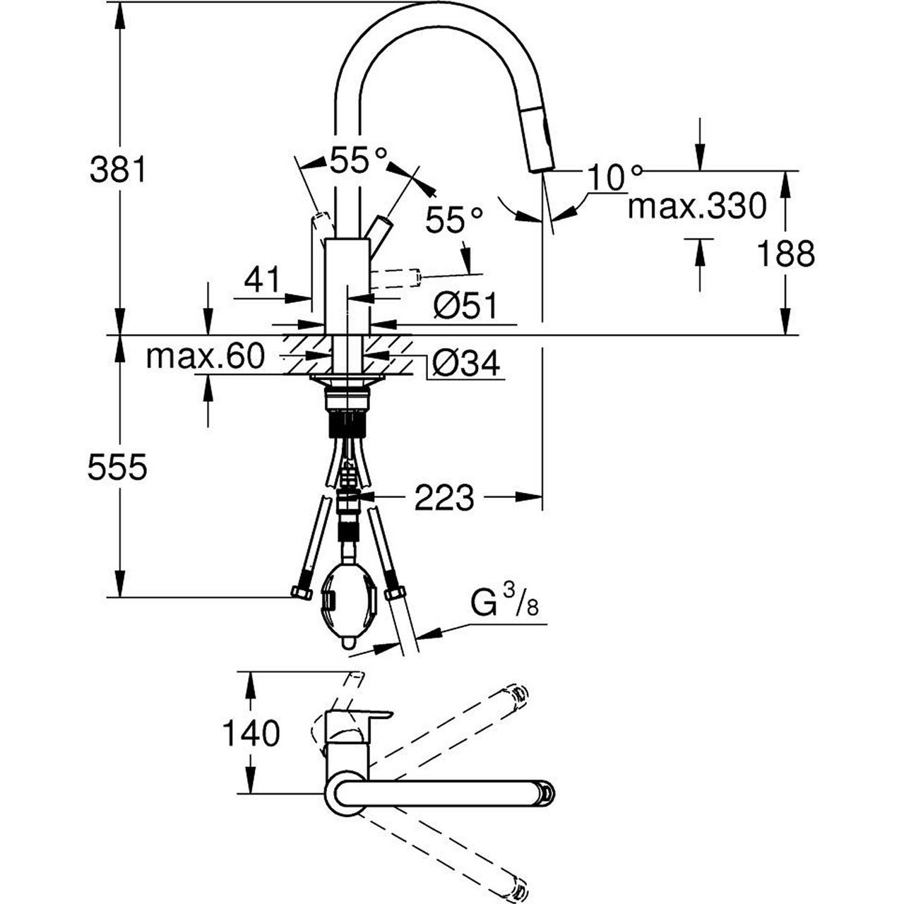 Dette kjøkkenarmaturet fra Grohe kombinerer elegant design med høy funksjonalitet og fleksibilitet. Den høye tuten gir god arbeidsplass ved vasken, og den uttrekkbare tuten gjør det enkelt å skylle grønnsaker, fylle kjeler og rengjøre vasken.
