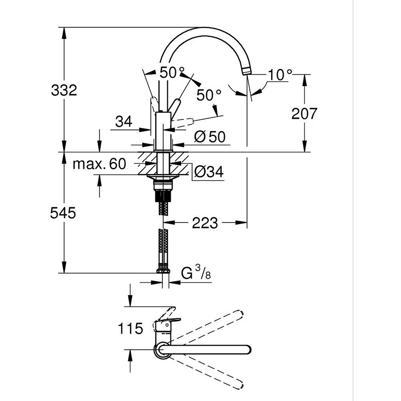 Montering: ett-hullsSvingradius: 360°Keramisk patron: 28 mmMaks gjennomstrømning (3 bar): 11,5 l/minMinimum trykk: 1 barHøyde: 33,2 cmVann- og avløpsinstallasjoner må installeres av rørlegger.
