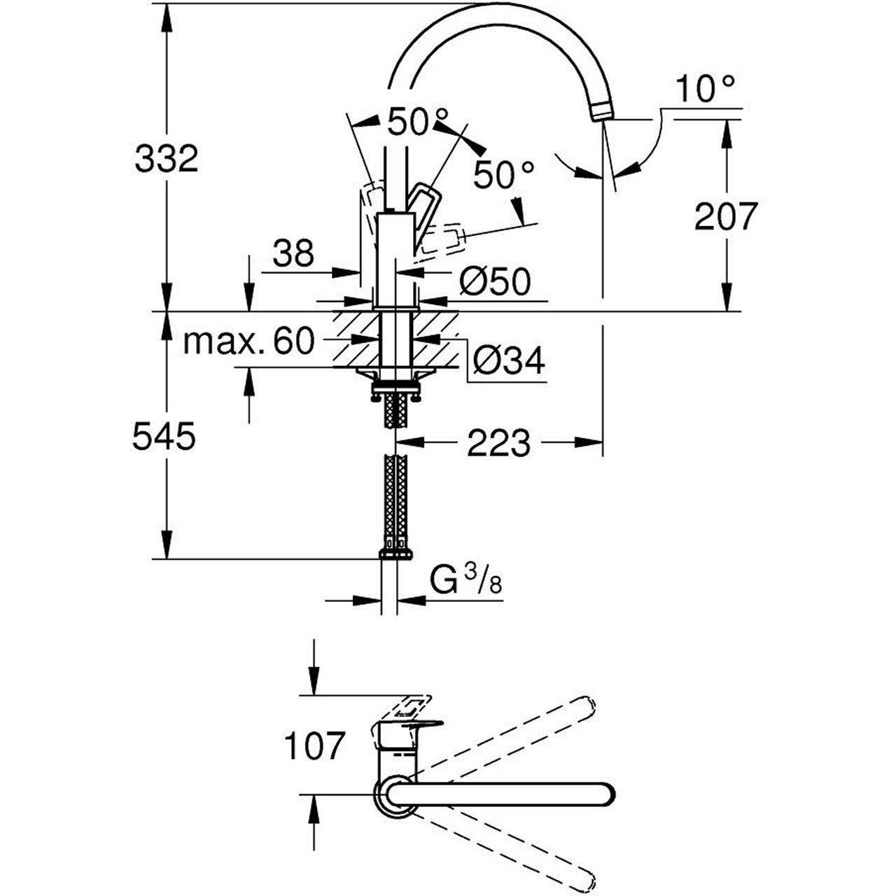 Montering: ett-hullsSvingradius: 360°Keramisk patron: 28 mmMinimum driftstrykk: 1,0 barMaks gjennomstrømning (3 bar): 11,5 l/minTilkoblingsslanger: fleksible 3/8"Høyde: 33,2 cmVann- og avløpsinstallasjoner må installeres av rørlegger.