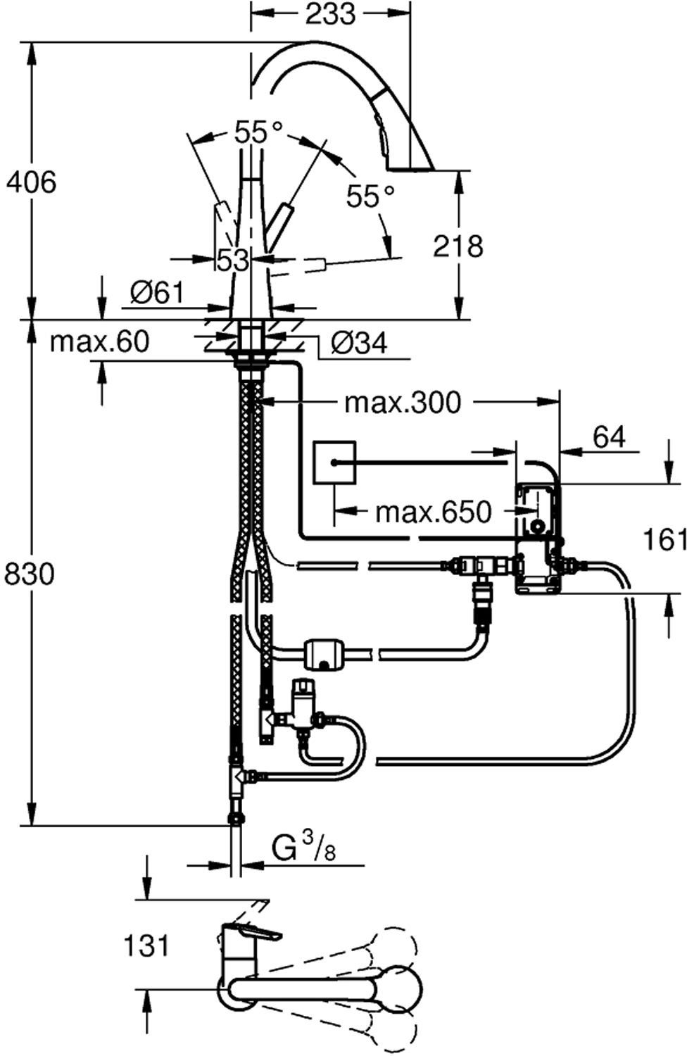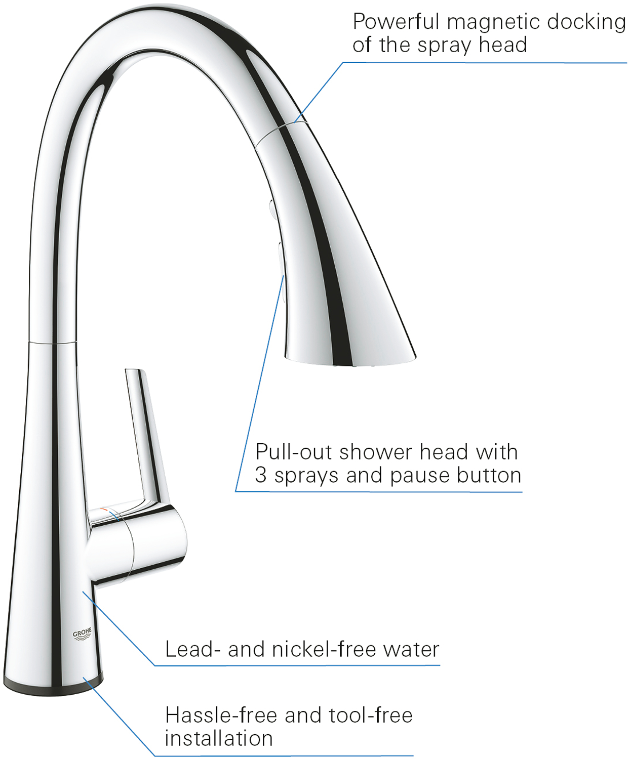 Touch: aktivering av vann via hudkontaktbatteriets strømforsyning 6 V lithium-batteri, type CR-P2CE-nummermagnetventilblandingsventil med fast verdiautomatisk sikkerhetsstopp etter 60 sekunder (produsentinnstilling)beskyttelse IP 44GROHE StarLight krom overflateGROHE SilkMove 35 mm keramisk PatronGROHE Zero innvendig isolerte vannveier - bly- og nikkelfriGROHE Magnetisk docking garanterer enkel og jevn tilbaketrekning av sprayhodet tilbake til startposisjonenuttrekksspray med 3 spraytyperBytt mellom laminær spray / SpeedClean dusjstråle / GROHE Bladespray (redusert vannforbruk med opptil 70% og enda sterkere ytelse)stoppfunksjon - pauseknapp for å stoppe vannføringenautomatisk tilbakestilling til laminar sprayvariable justerbar volumbegrensersvingbar rørtutsvingradius 360°med tilbakeslagsventilfleksible tilkoblingsslangerVann- og avløpsinstallasjoner må installeres av rørlegger.