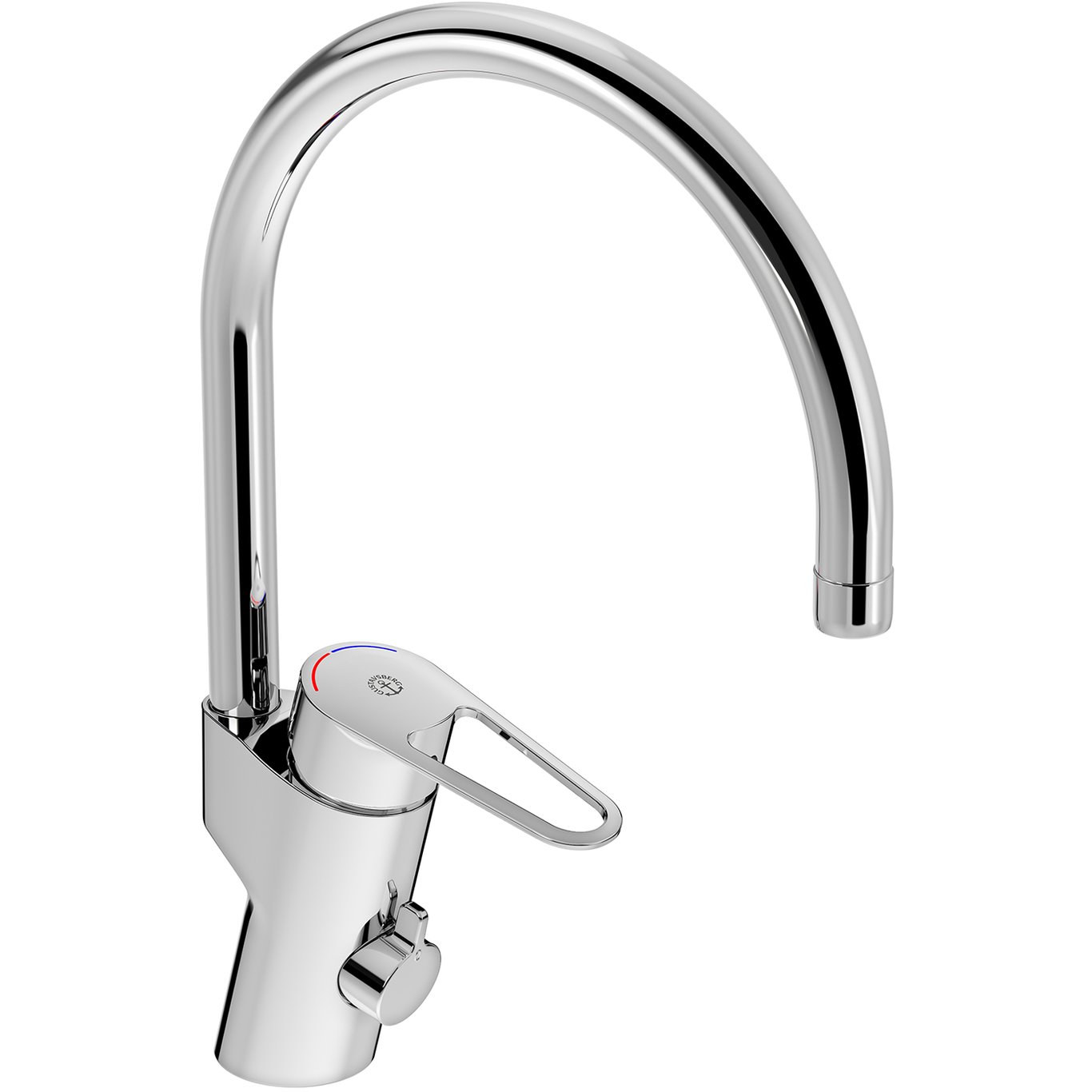 Denne kjøkkenkranen fra Gustavsberg har et design som gjør rengjøring av større gryter og bøtter enkelt. Spaken gir et godt grep og er tydelig fargemerket for varmt og kaldt vann.