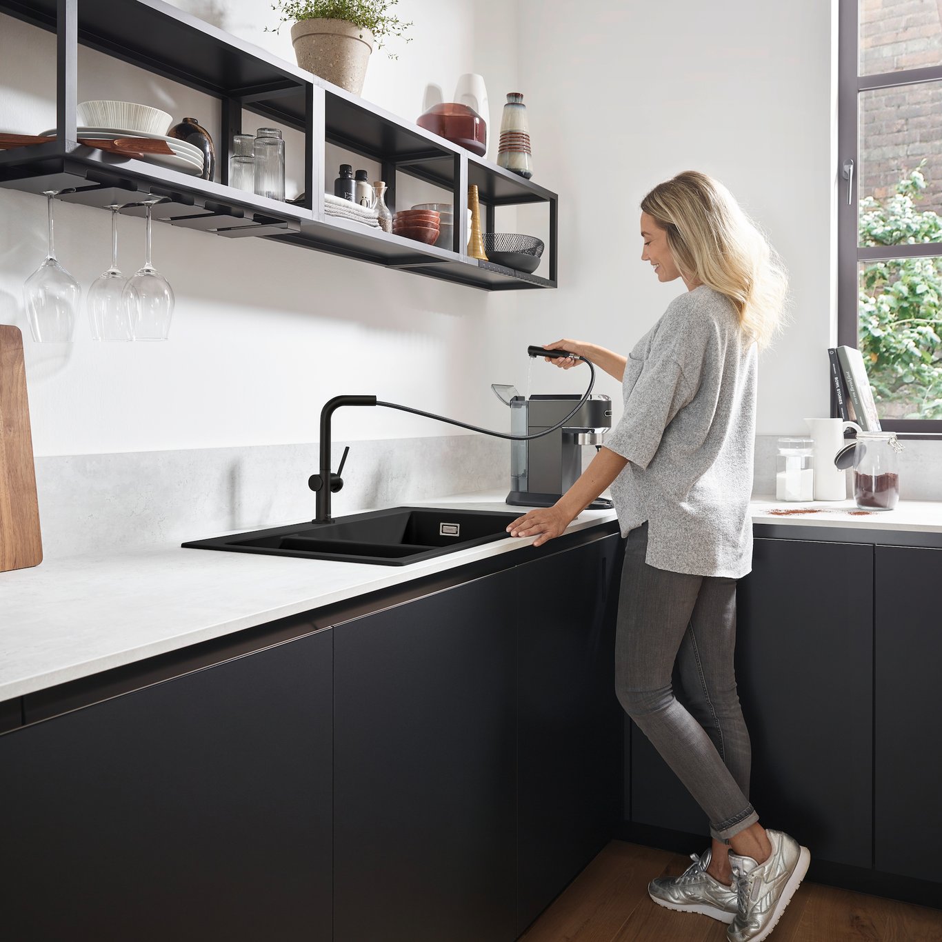 Talis M54 1-greps kjøkkenarmatur 270 fra Hansgrohe har en moderne overflate i matt sort, og en uttrekkbar tut.