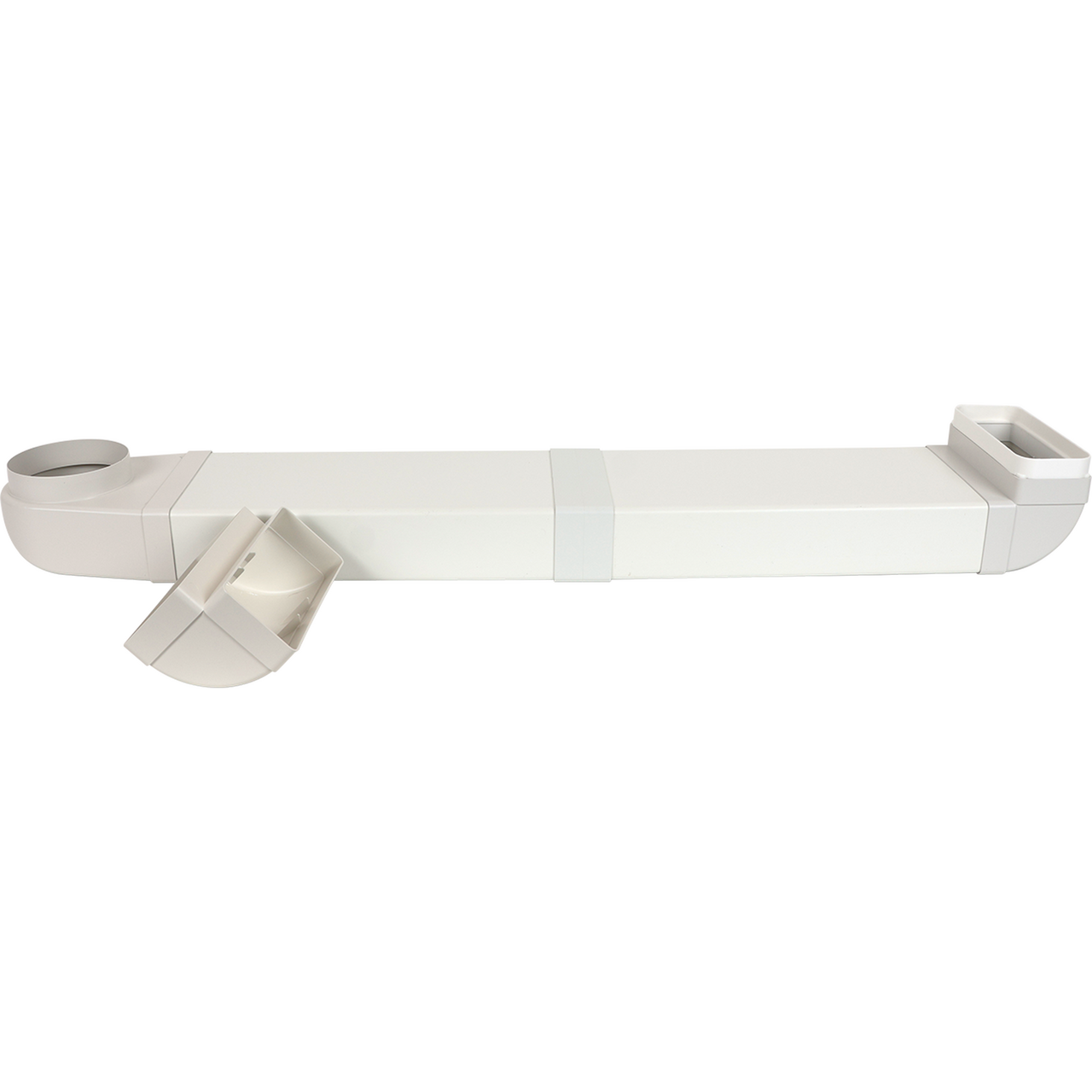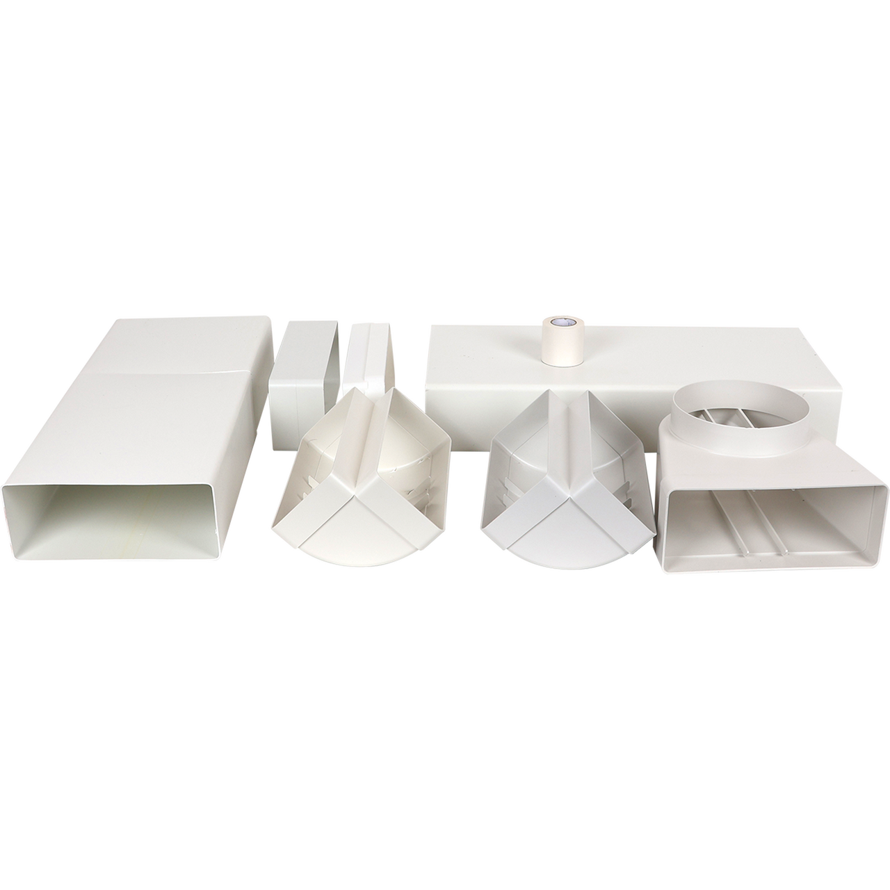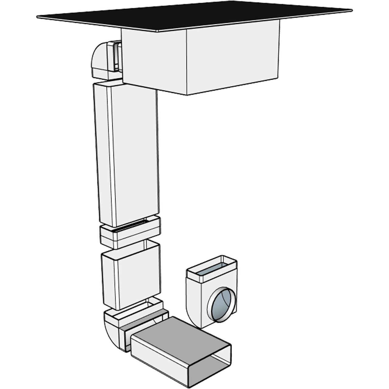 Det inneholder standard rørdeler som trengs for å installere avtrekk til platetopper med innebygd ventilator. De faste rørene gir lav motstand i systemet, noe som bidrar til bedre effektivitet. Komponentene er laget av robust, slitesterk hvit plast som sikrer lang levetid, og den enkle, lettmonterte konstruksjonen gjør installasjonen rask og problemfri.