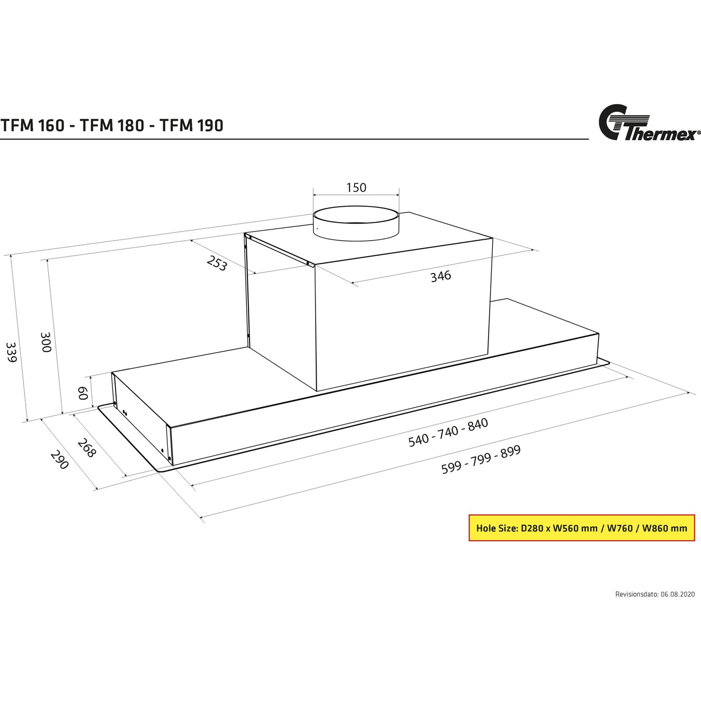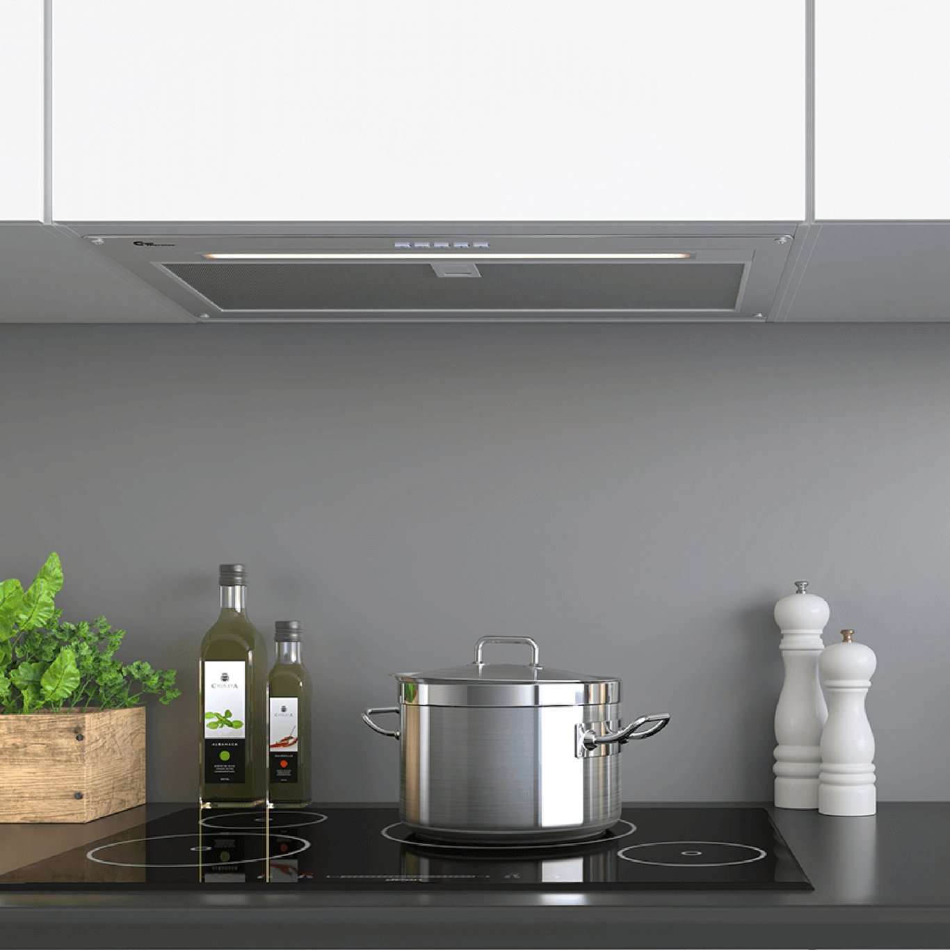 Thermex TMF for montering i skap kommer i tre forskjellige størrelser 160 - 180 - 190. Kjøkkenhetten har energivennlig LEL-belysning, med mulighet for kommunikasjon med balansert ventilasjonsanlegg, både for modeller med intern eller ekstern motor, ved bruk av Trigger Modul. **Thermex Trigger Modul kjøpes separat.**