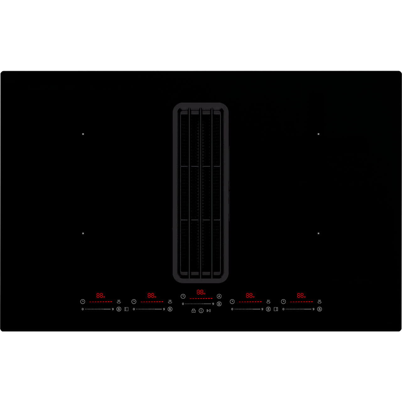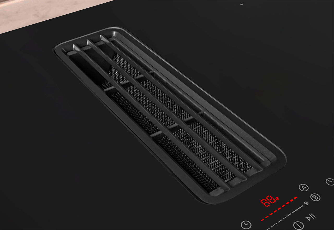 Den har en svart stålrister med effektiv innsugning og et C-formet fettfilter som også fanger opp søl. Fem separate slider-touchkontroller gir presis styring av hver kokesone og ventilatoren. Den glatte overflaten rengjøres enkelt med vanlig vindusrens, og fettfilteret kan raskt tas av og vaskes i oppvaskmaskinen.