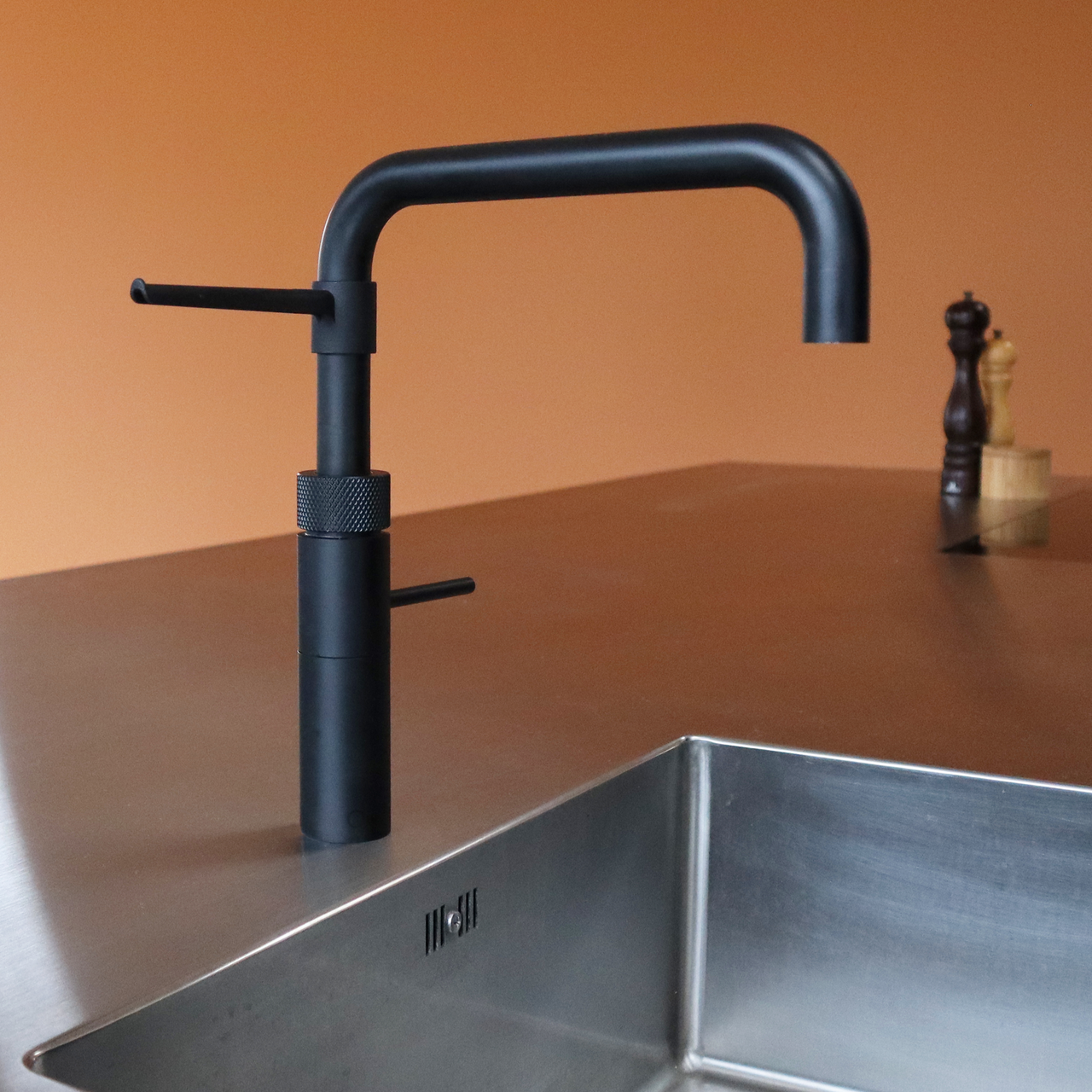Denne klutholderen er laget i sort plast med et minimalistisk og funksjonelt design som integreres i kjøkkenkranen.