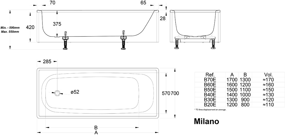 Laufen stålbadekar milano 170 cm inkl. ben