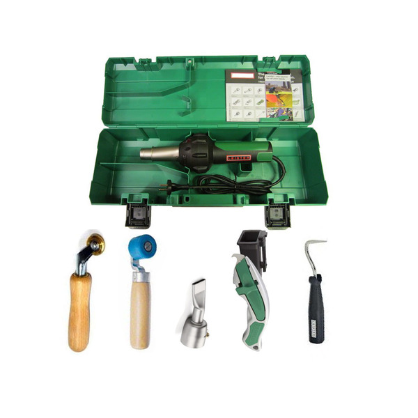 Denne sveisekofferten fra Litex består av en varmluft sveisepistol, en smal trykkrulle, en 28 mm teflon trykkrulle, en 20 mm dyse, en kniv med taske og 5 blader, og et kontrollverktøy.