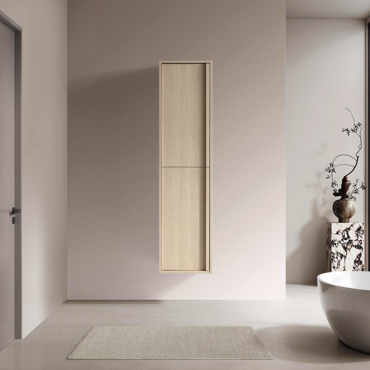 Lind Aura er en minimalistisk møbelserie, som passer godt inn på ethvert moderne baderom. Dette høyskapet har innfelte håndtak som sikrer et stilrent uttrykk.