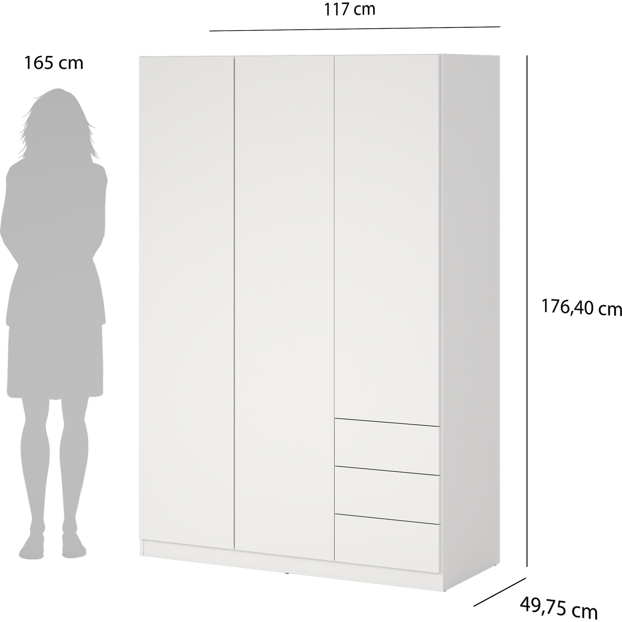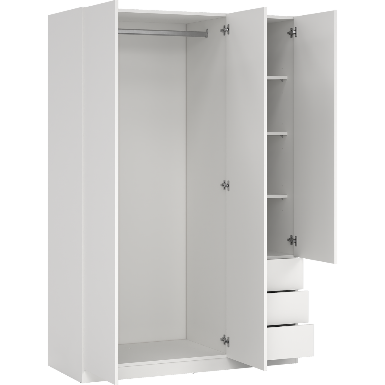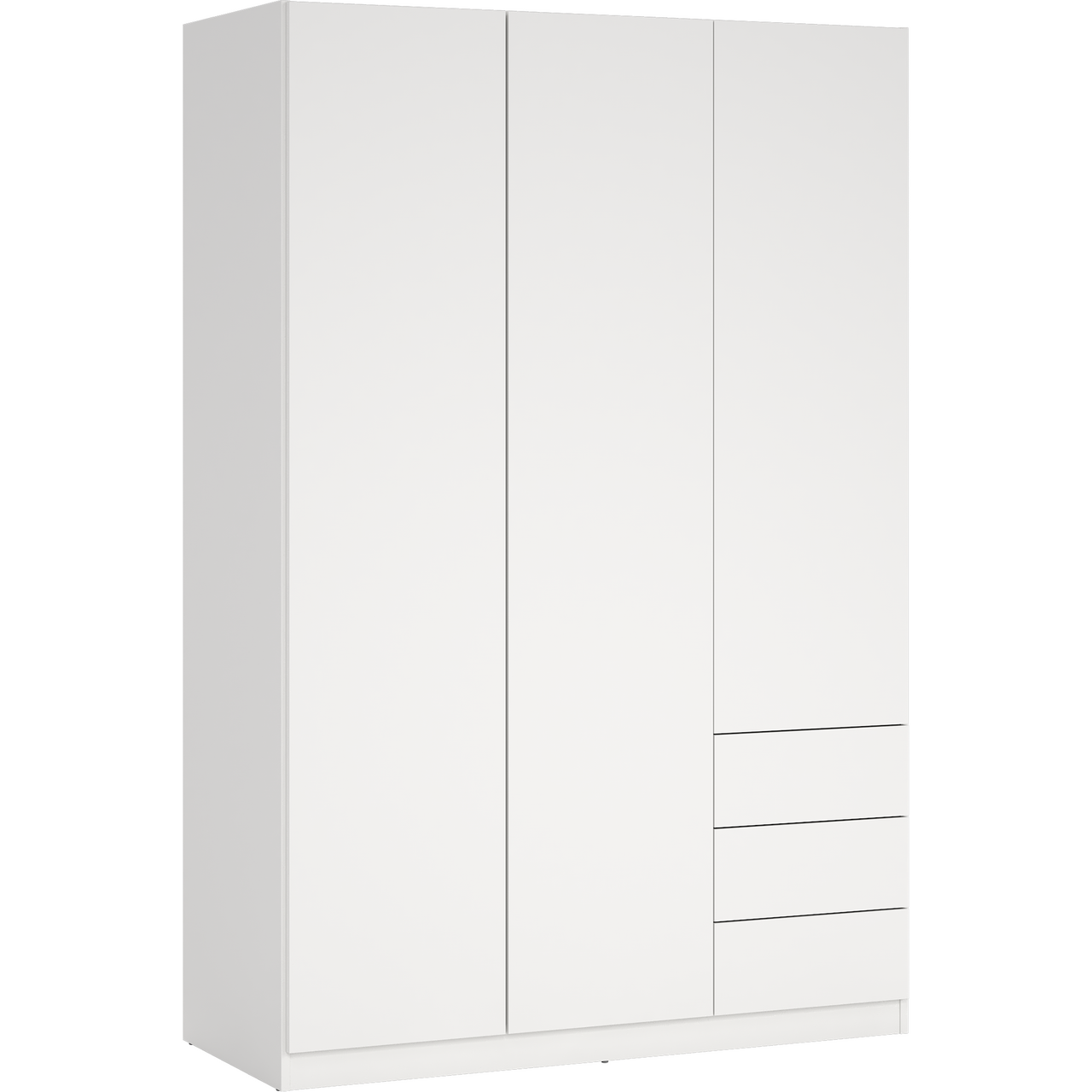 Skapet har tre dører og byr på praktisk oppbevaring med én fast hylle, tre justerbare hyller og en klesstang som holder orden på plaggene. I tillegg gir tre romslige skuffer god ekstra lagringsplass.