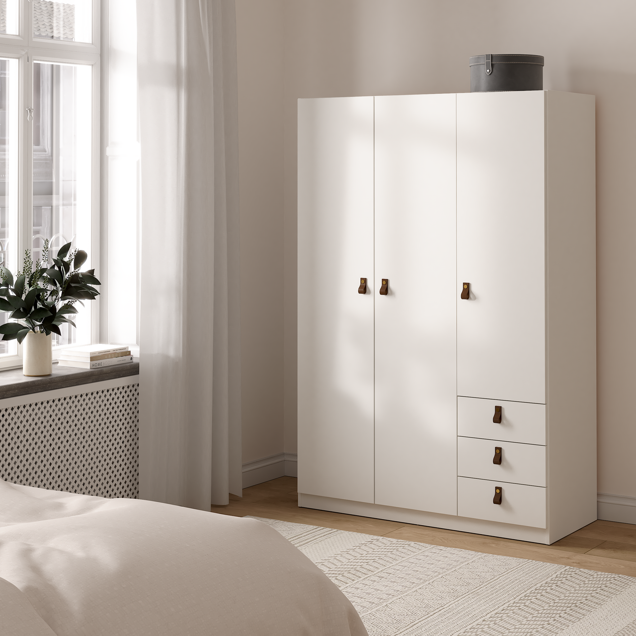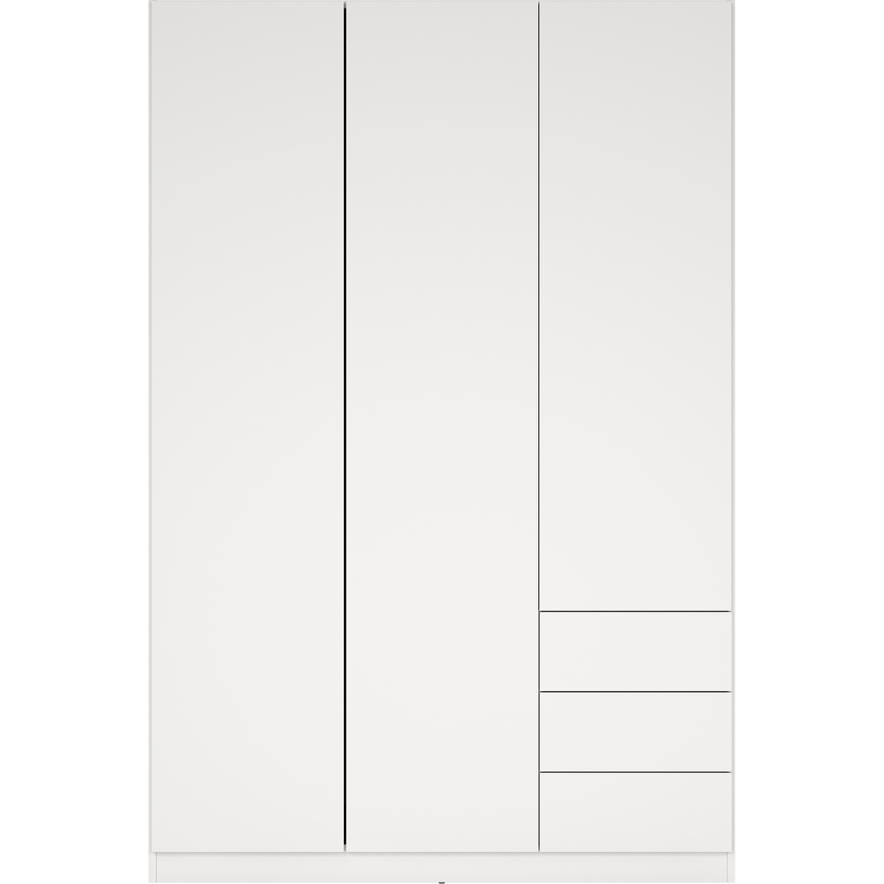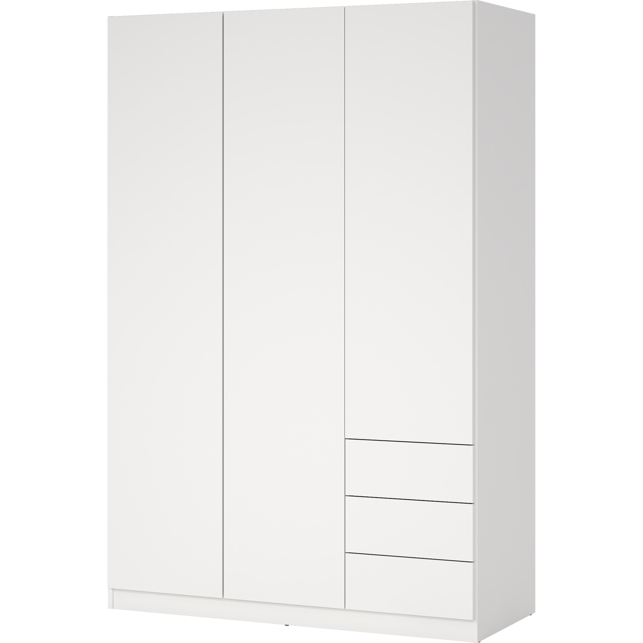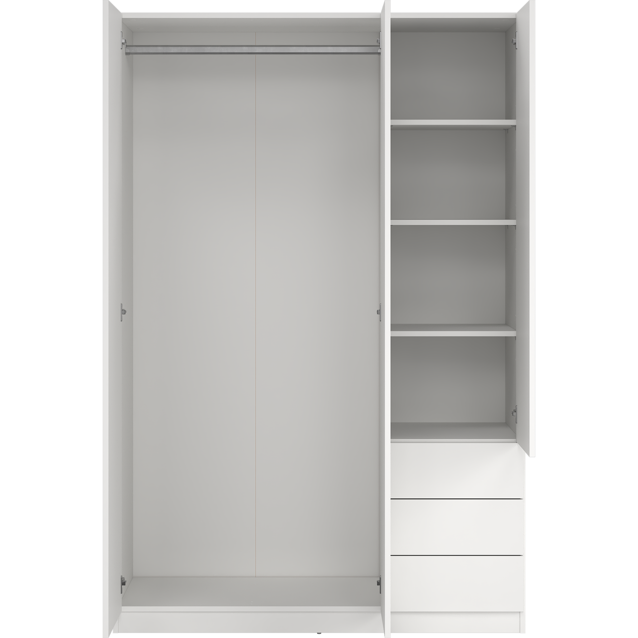 Skapet har tre dører og byr på praktisk oppbevaring med én fast hylle, tre justerbare hyller og en klesstang som holder orden på plaggene. I tillegg gir tre romslige skuffer god ekstra lagringsplass.