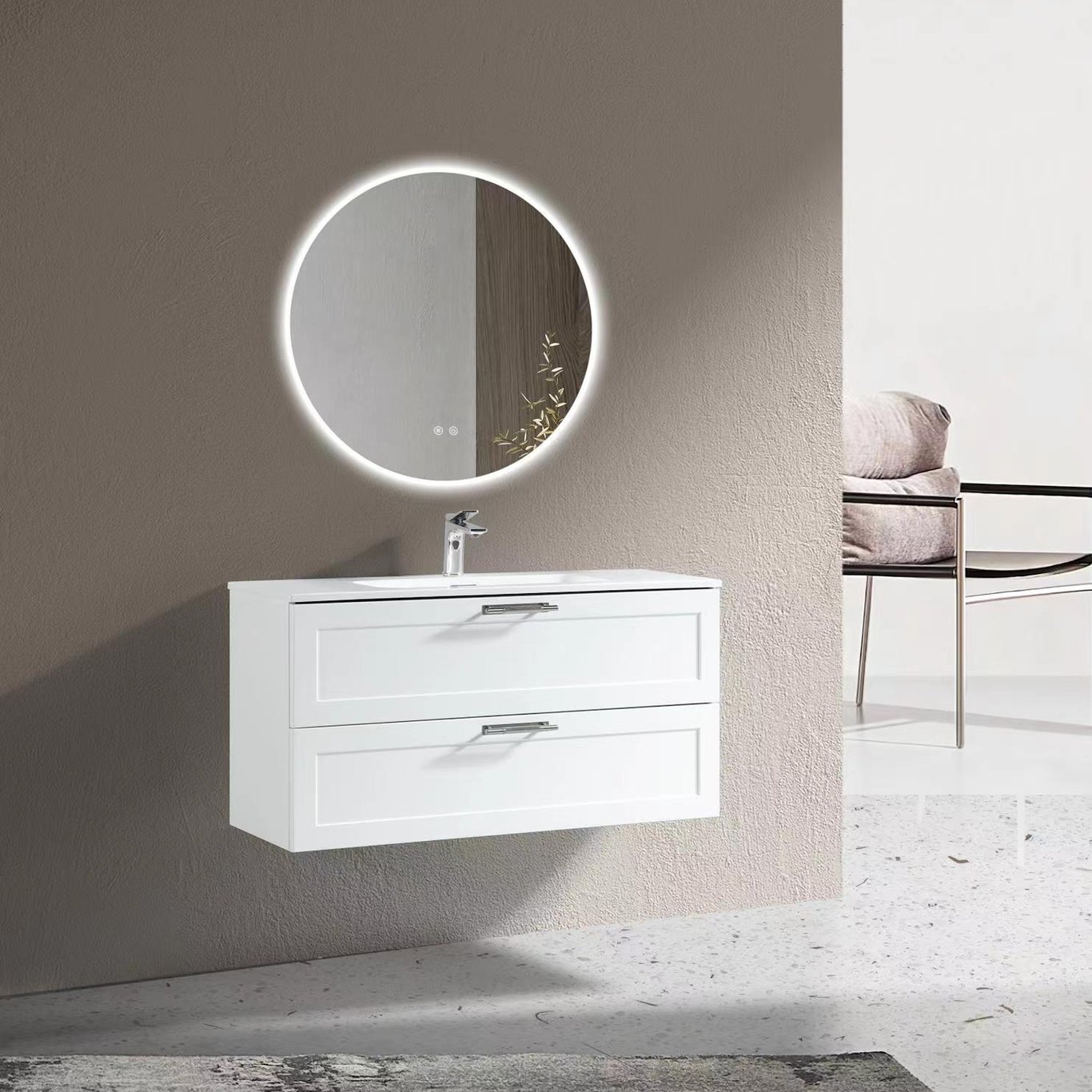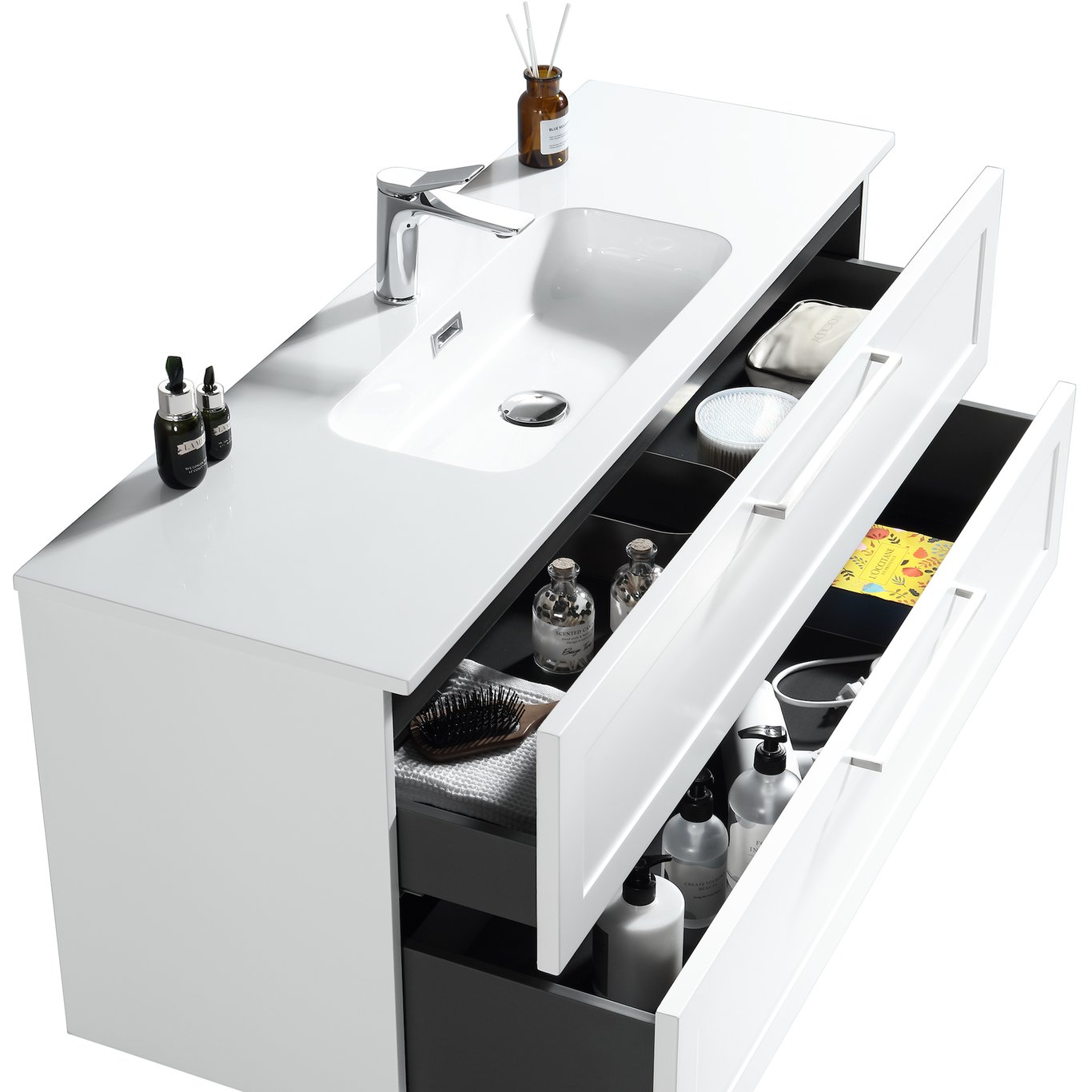 Baderomsmøbelet har en foliert overflate, som gjør rengjøringen enklere og bevarer møbelets slitestyrke. Det kommer ferdig montert, med en servant i støpemarmor. Møbelet finnes i flere størrelser, og det finnes også høyskap i samme serie. Skuffene har en soft close-funksjon som sørger for myk lukking og forlenget levetid.