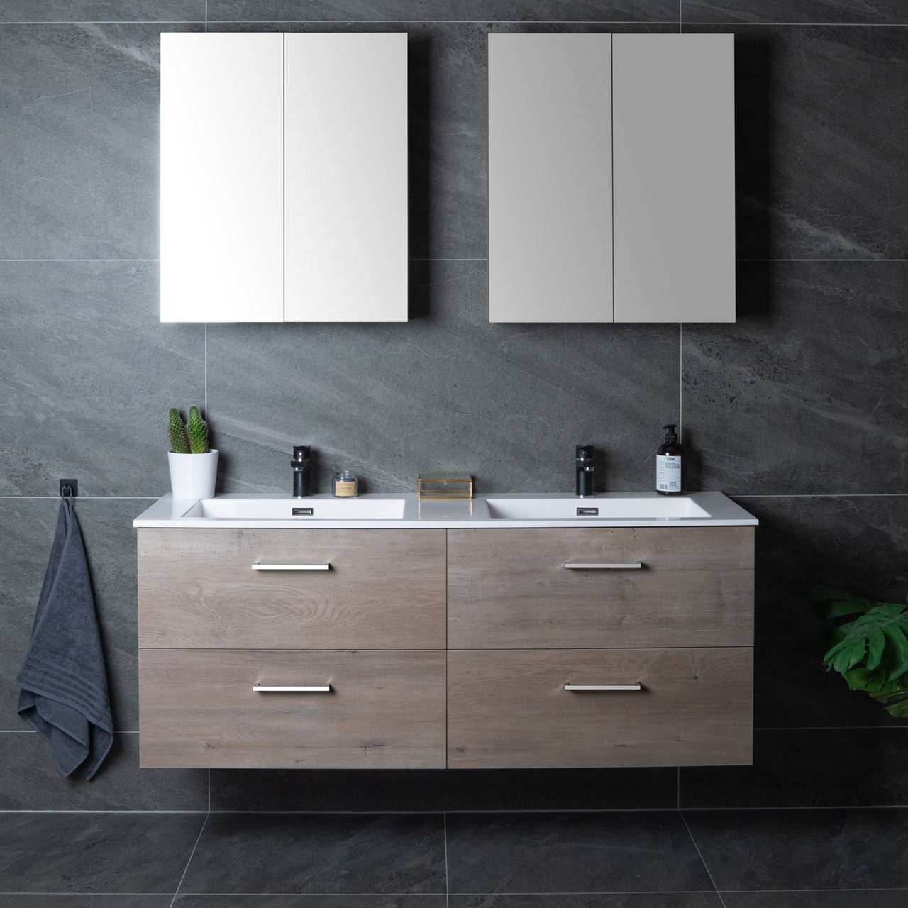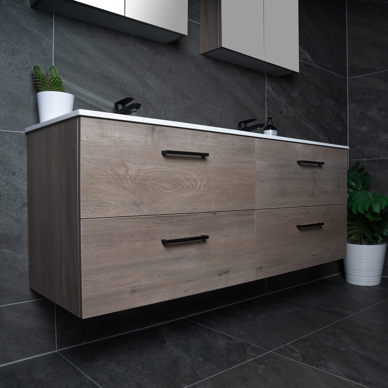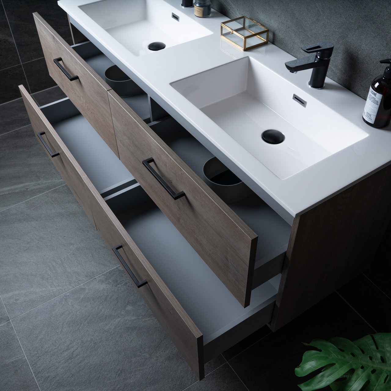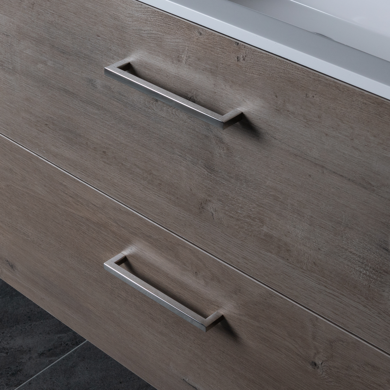 Baderomsmøbelet kommer ferdig montert og skuffene på møbelet har en soft close-funksjon som sørger for myk lukking og forlenget levetid. Baderomsmøbelet kommer uten håndtak slik at du kan sette ditt personlige preg på møbelet ved å velge håndtak selv.