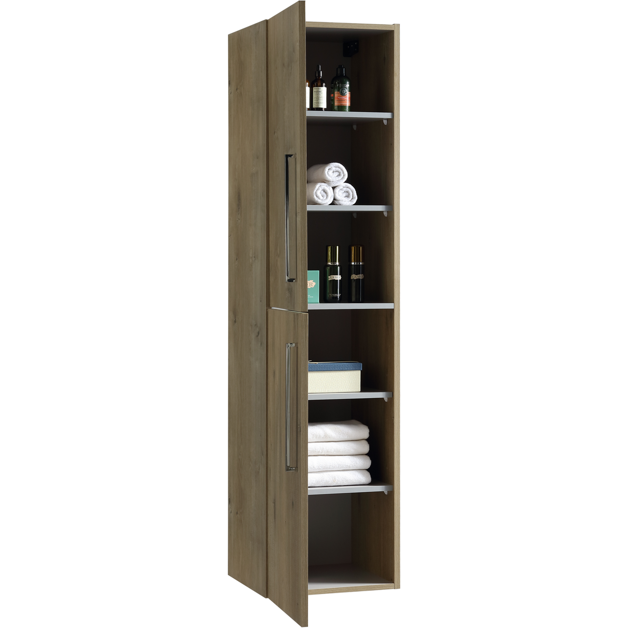 Lind Continental er en moderne møbelserie, som passer godt inn i de fleste baderom. Dette høyskapet har rette linjer, og en foliert overflate med imitasjon av tre. Den folierte overflaten gjør rengjøringen enklere, og bevarer møbelets slitestyrke.