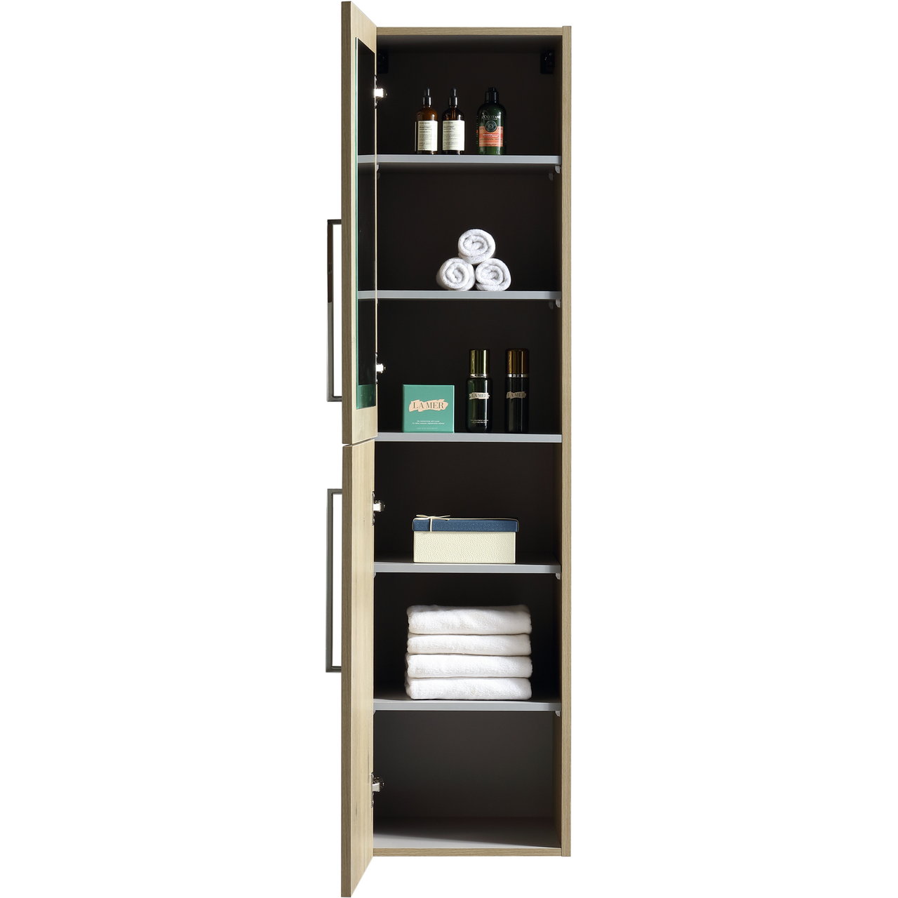 Høyskapet kommer ferdig montert, med et speil på innsiden av døren. Dørene har en soft close-funksjon som sørger for myk lukking og forlenget levetid. Det kommer uten håndtak, og du kan velge mellom matte sorte eller kromfargede håndtak.