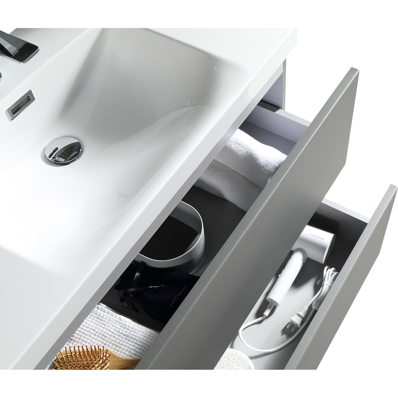 Baderomsmøbelet kommer ferdig montert, med en robust servant i støpemarmor. Møbelet finnes i flere størrelser, og det finnes også høyskap i samme serie. Skuffene har en soft close-funksjon som sørger for myk lukking og forlenget levetid. De kommer uten håndtak, slik at du kan sette ditt personlige preg på møbelet ved å velge håndtak selv.
