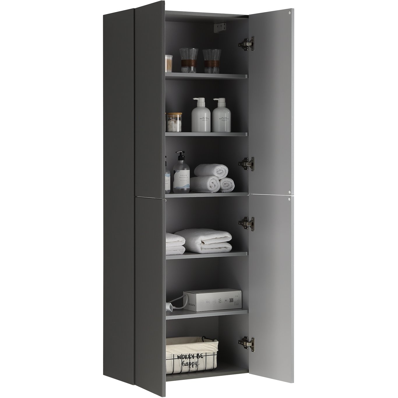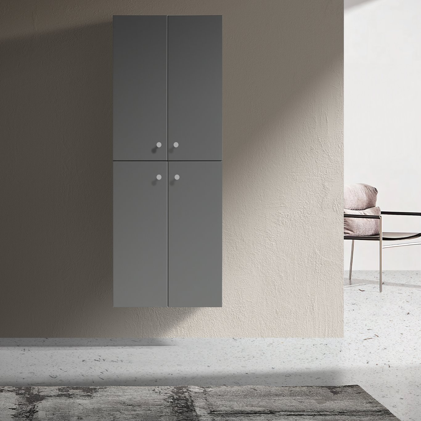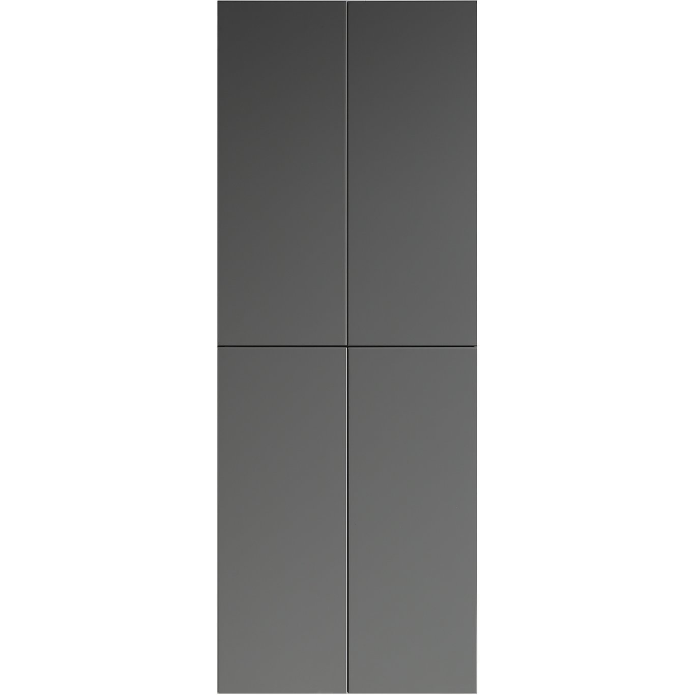 Høyskapet kommer ferdig montert, og har fire dører. Det finnes også baderomsmøbel i samme serie. Dørene har en soft close-funksjon som sørger for myk lukking og forlenget levetid. De kommer uten håndtak, slik at du kan sette ditt personlige preg på møbelet ved å velge håndtak selv.
