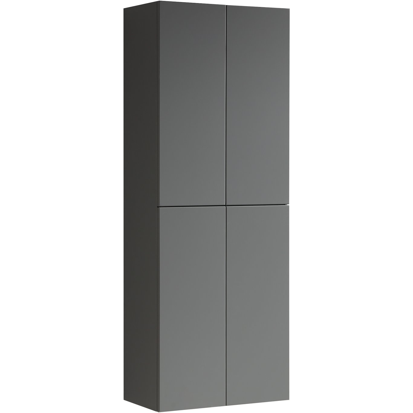 Lind Delight er en moderne møbelserie, som passer godt inn i de fleste baderom. Dette doble høyskapet har rette linjer, og en foliert, matt grå overflate. Den folierte overflaten gjør rengjøringen enklere, og bevarer møbelets slitestyrke.