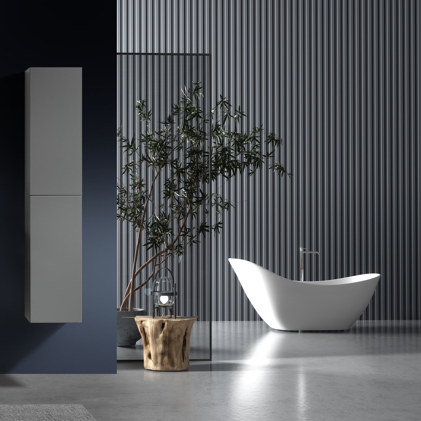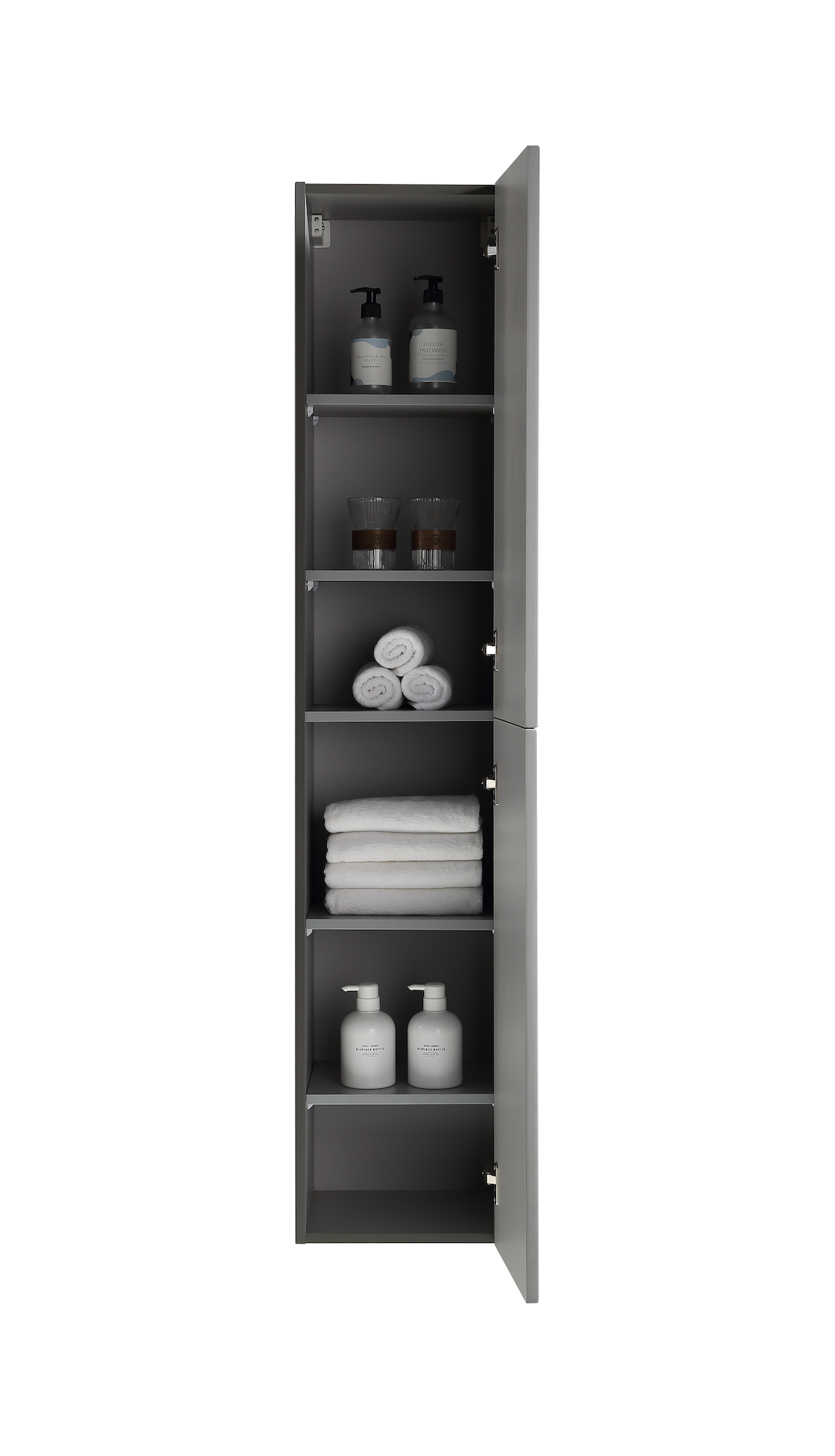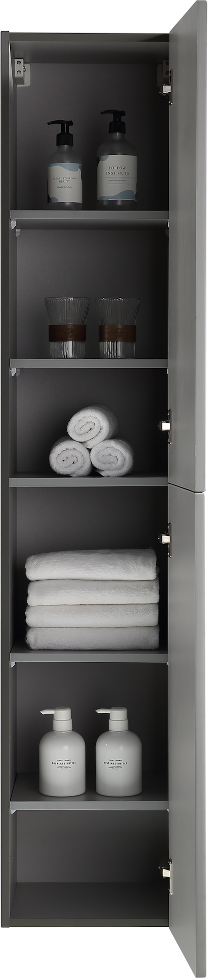 Høyskapet kommer ferdig montert, og har to dører. Det finnes også baderomsmøbel i samme serie. Dørene har en soft close-funksjon som sørger for myk lukking og forlenget levetid. De kommer uten håndtak, slik at du kan sette ditt personlige preg på møbelet ved å velge håndtak selv.