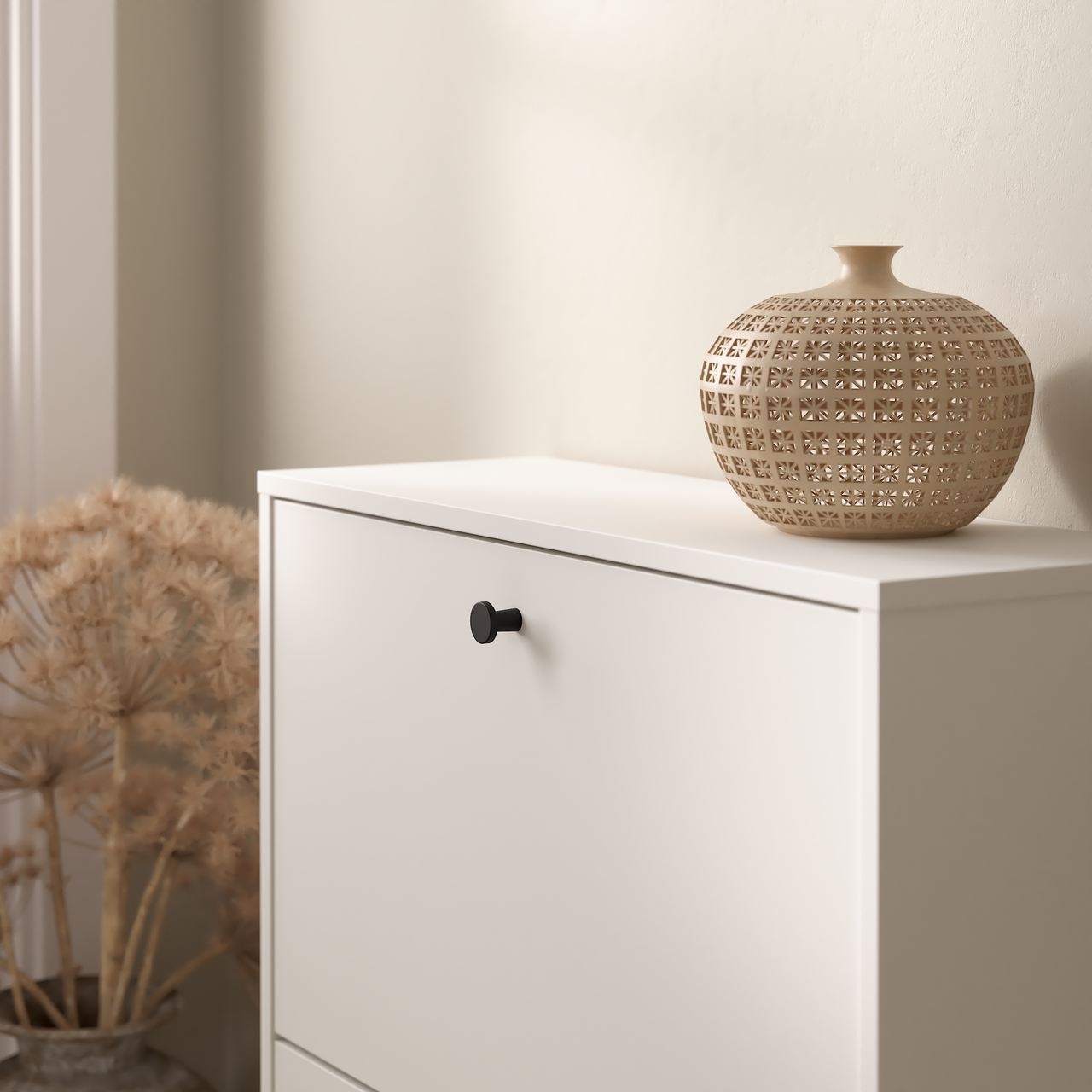 Fiora skoskap fra Lind er en allsidig og minimalistisk plassbesparende oppbevaringsløsning, med to rom og nedfellbare dører.