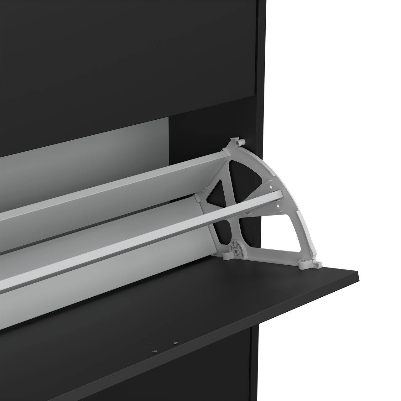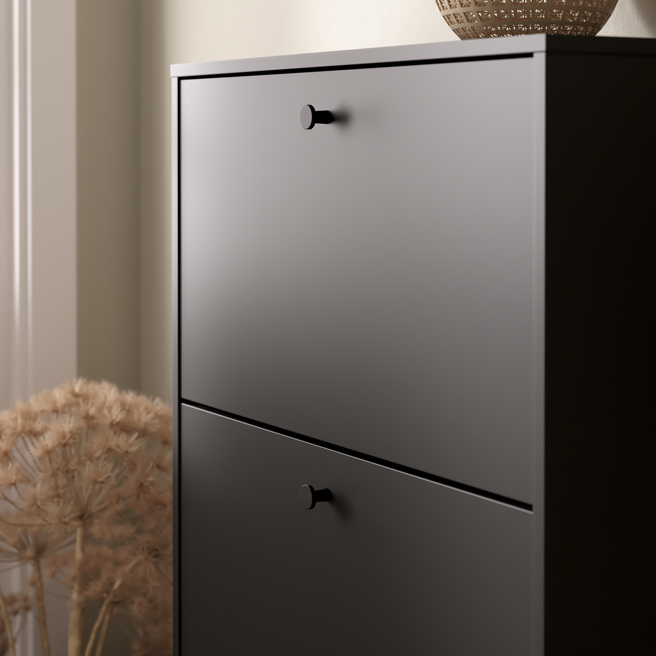 Fiora skoskap fra Lind er en allsidig og minimalistisk plassbesparende oppbevaringsløsning, med to rom og nedfellbare dører.