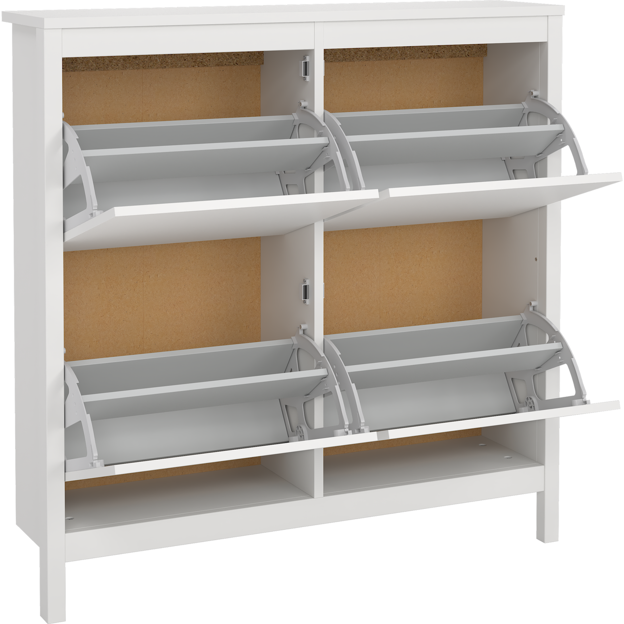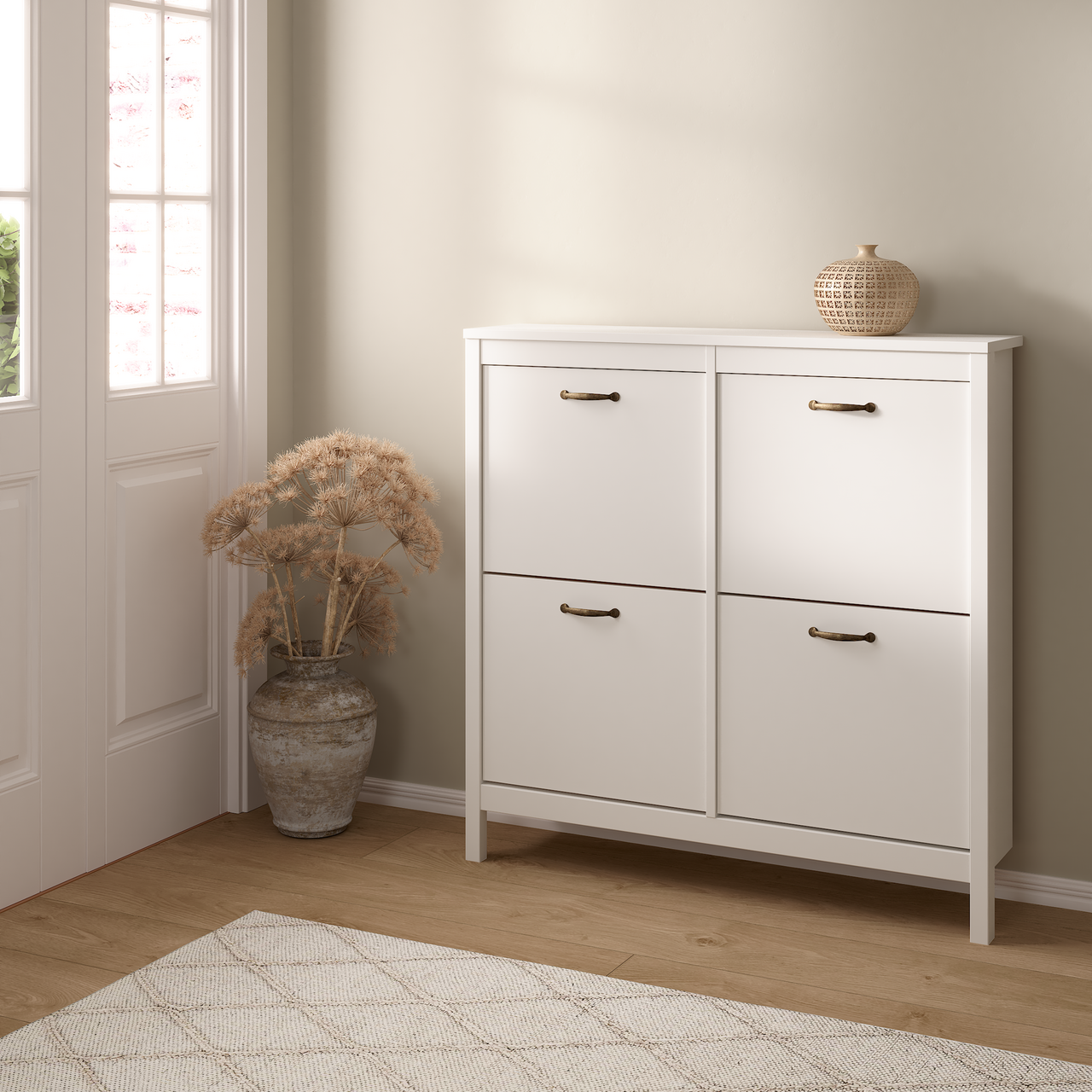 Leona skoskap fra Lind kombinerer en praktisk løsning med plass til opptil 16 par sko. Med fire nedfellbare dører får du en praktisk oppbevaring, samtidig som fottøyet holdes organisert og lett tilgjengelig.