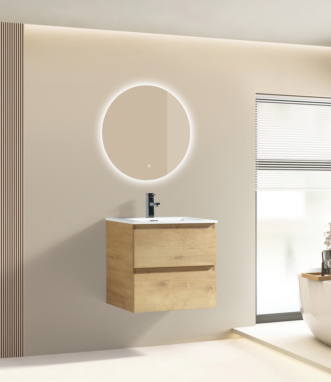Lind Natural er en moderne møbelserie i en eikefarge som passer perfekt inn i den skandinaviske stilen. Dette baderomsmøbelet har rette linjer og en foliert overflate. Den folierte overflaten gjør rengjøringen enklere, og bevarer møbelets slitestyrke.