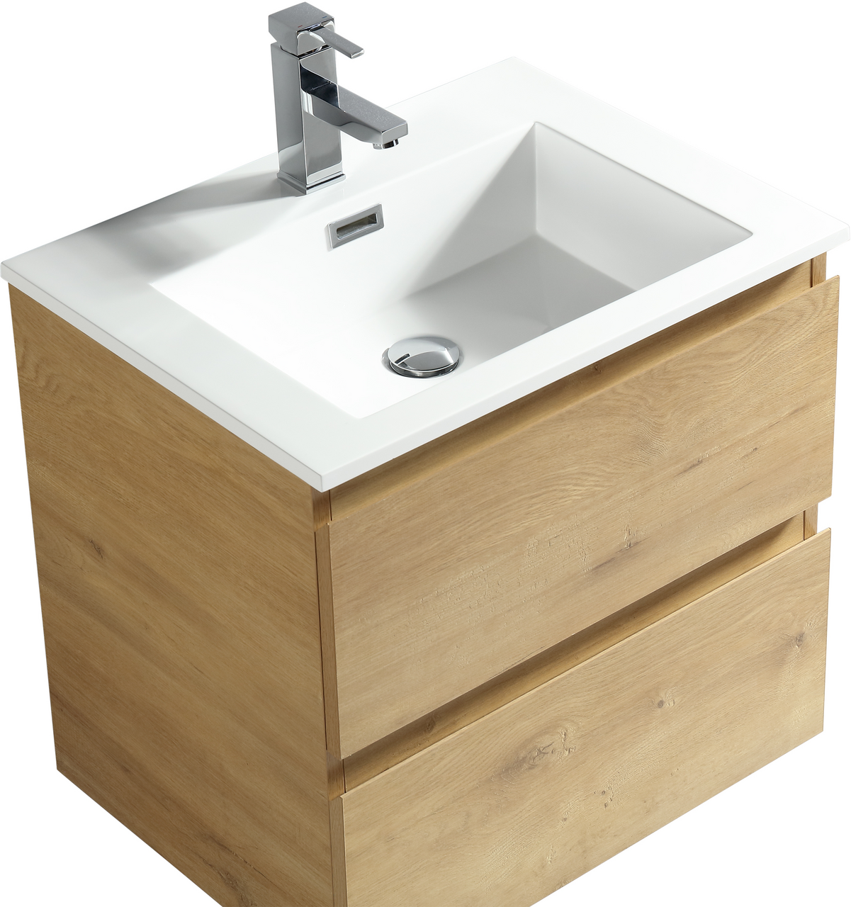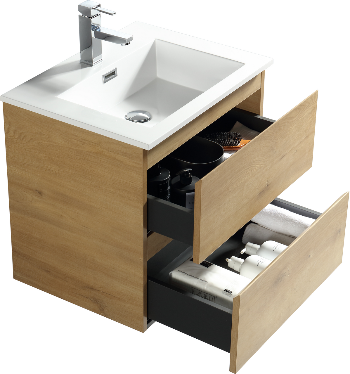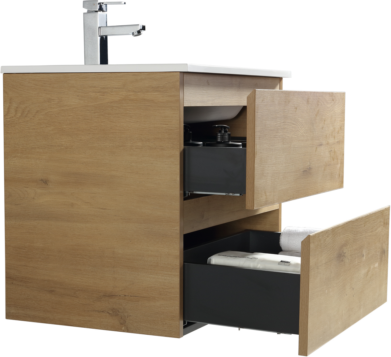 Baderomsmøbelet kommer ferdig montert med innfelte håndtak, og en soft close-funksjon som sørger for myk lukking og forlenget levetid.