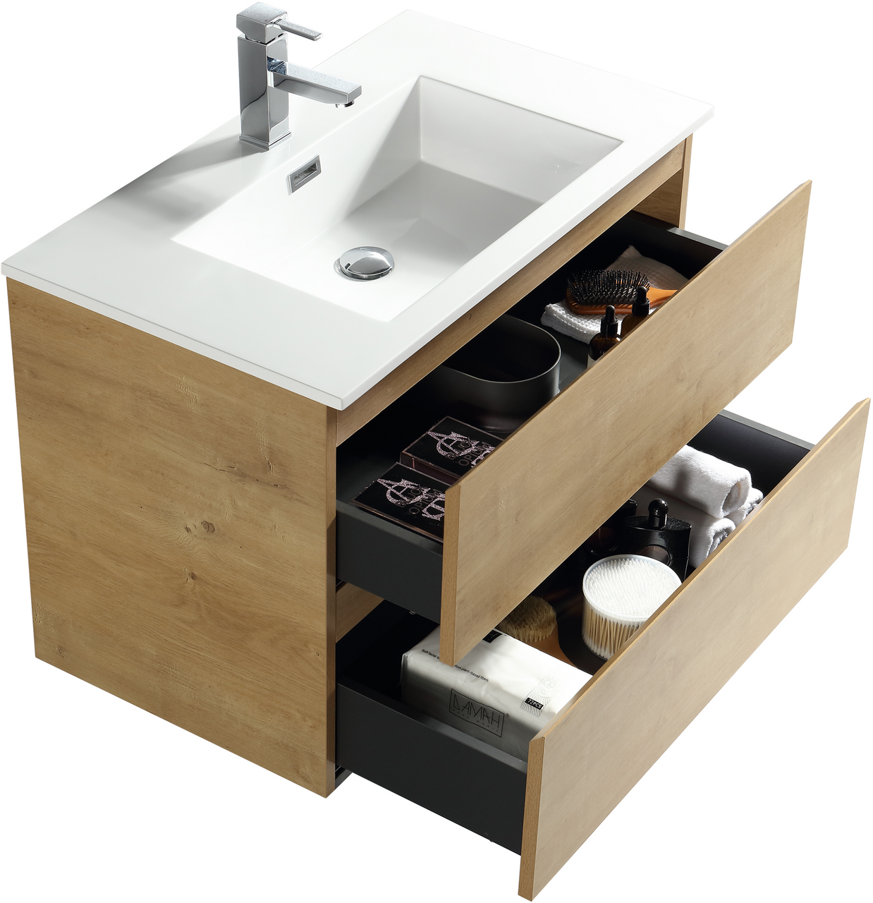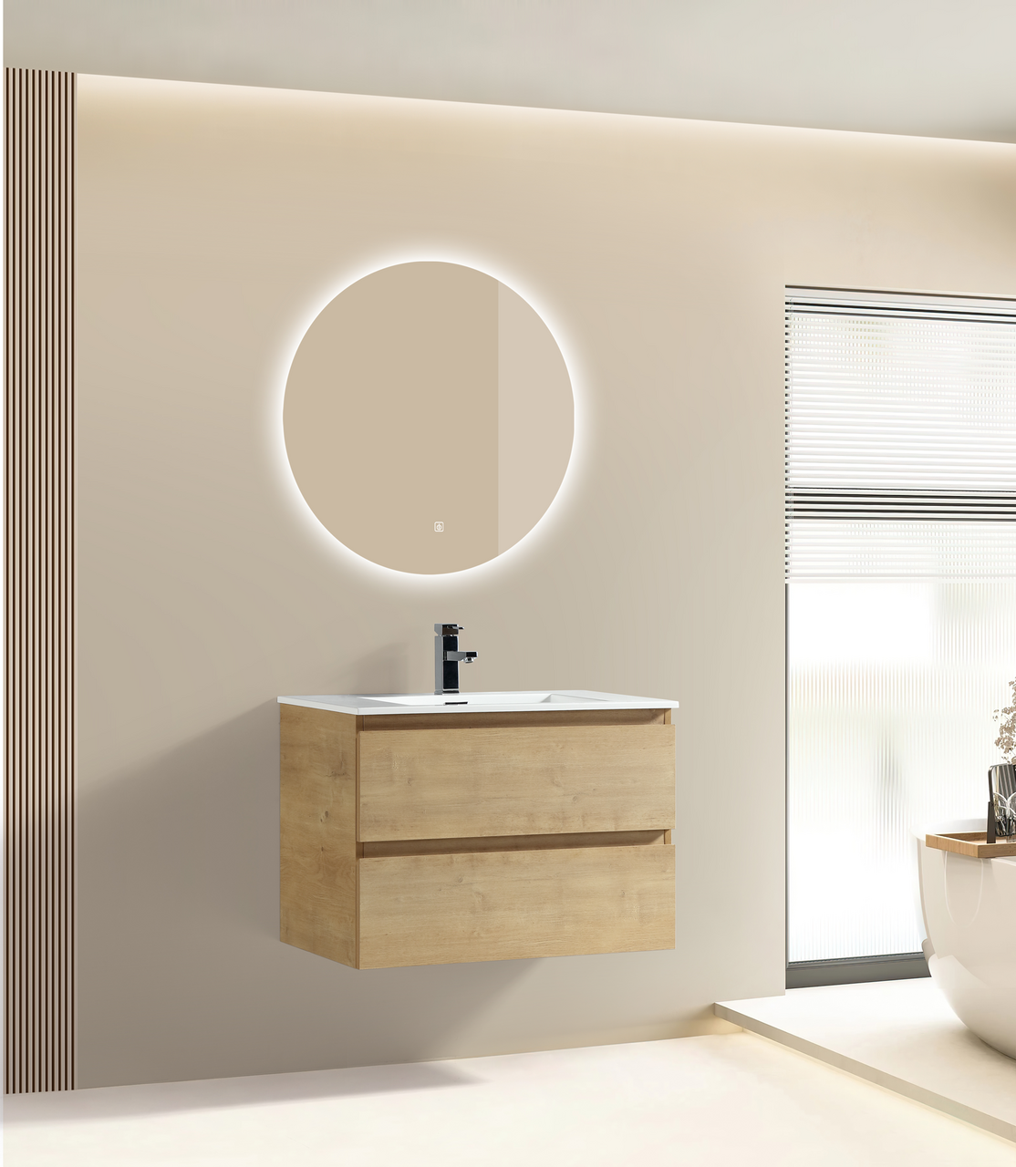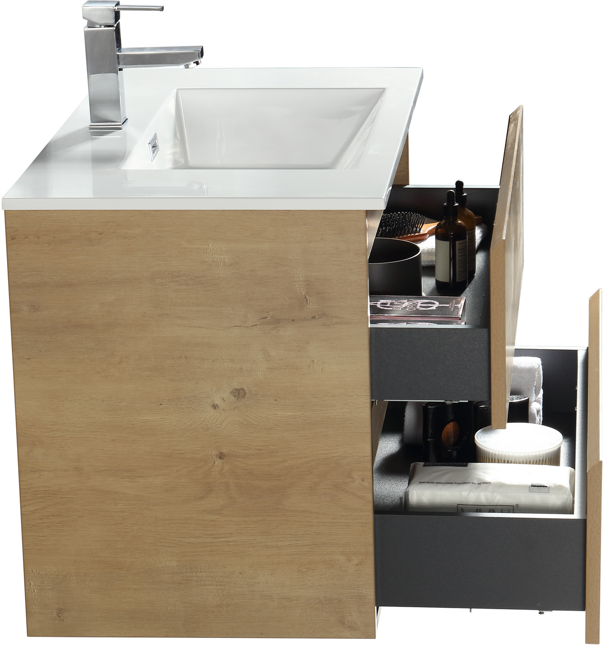 Baderomsmøbelet kommer ferdig montert med innfelte håndtak, og en soft close-funksjon som sørger for myk lukking og forlenget levetid.
