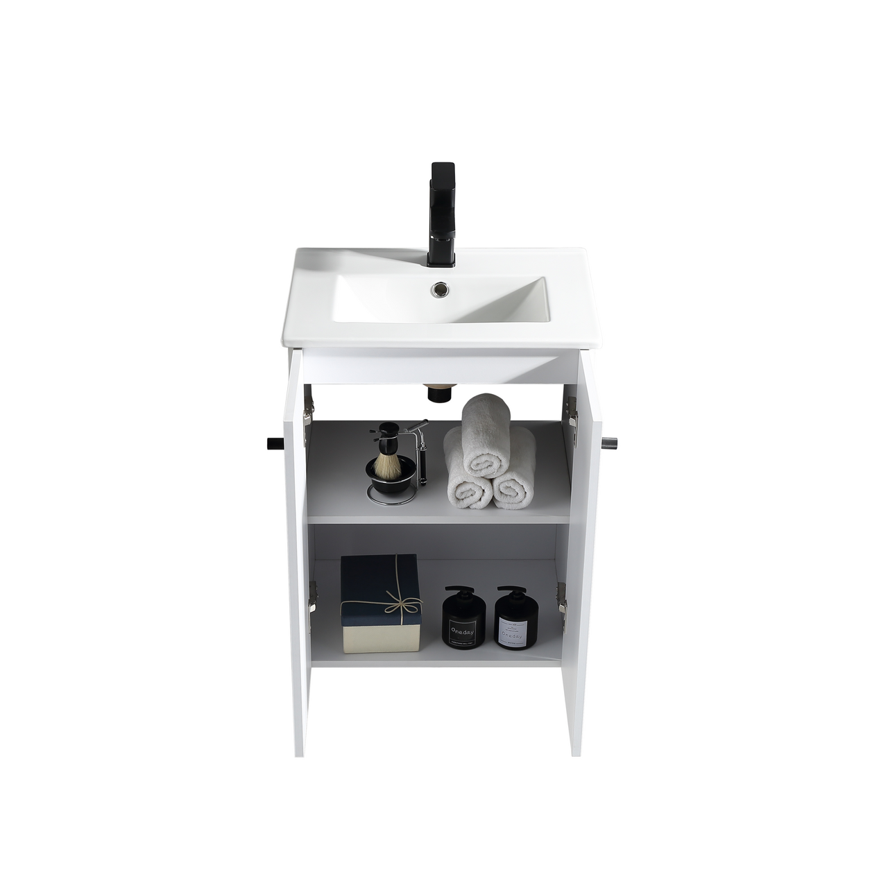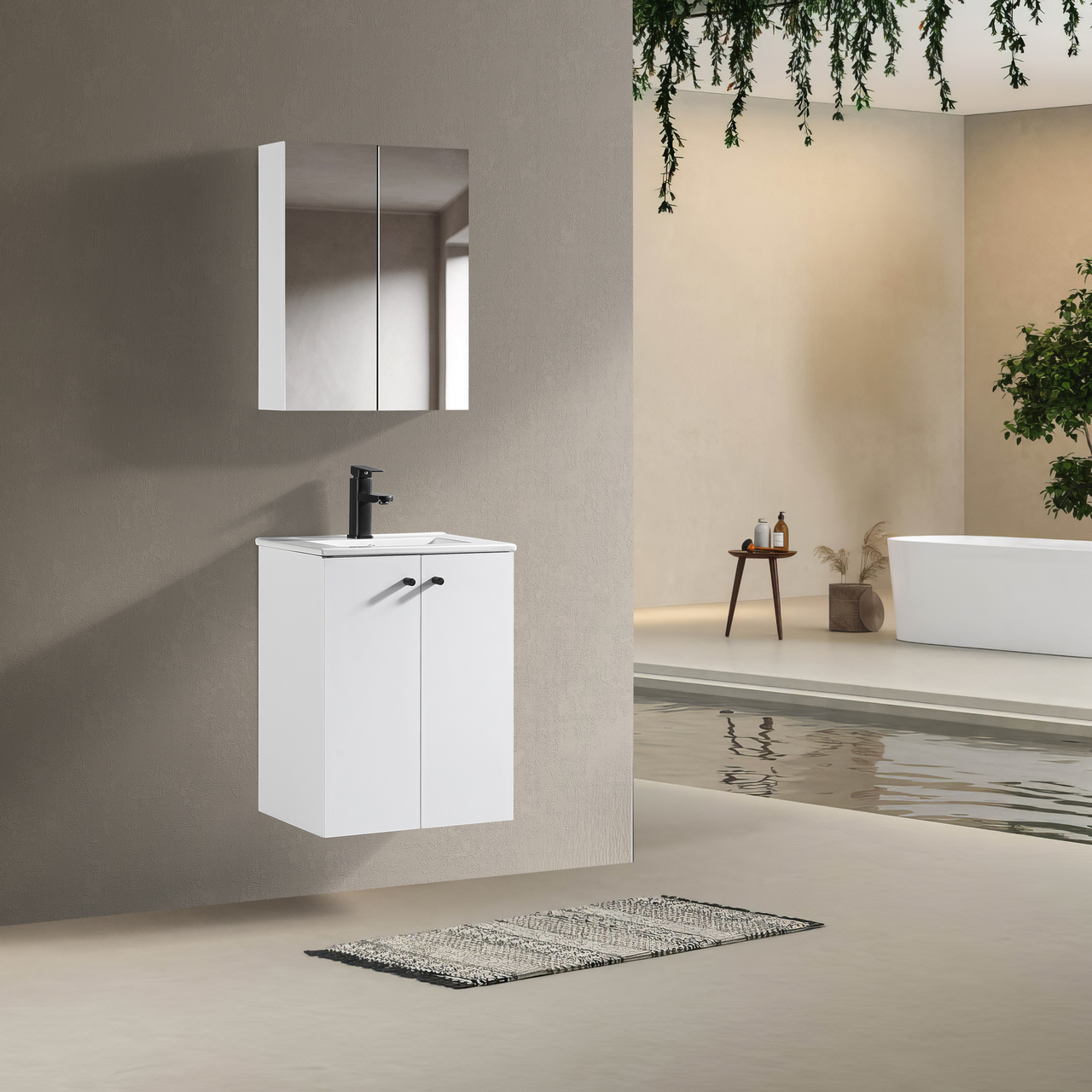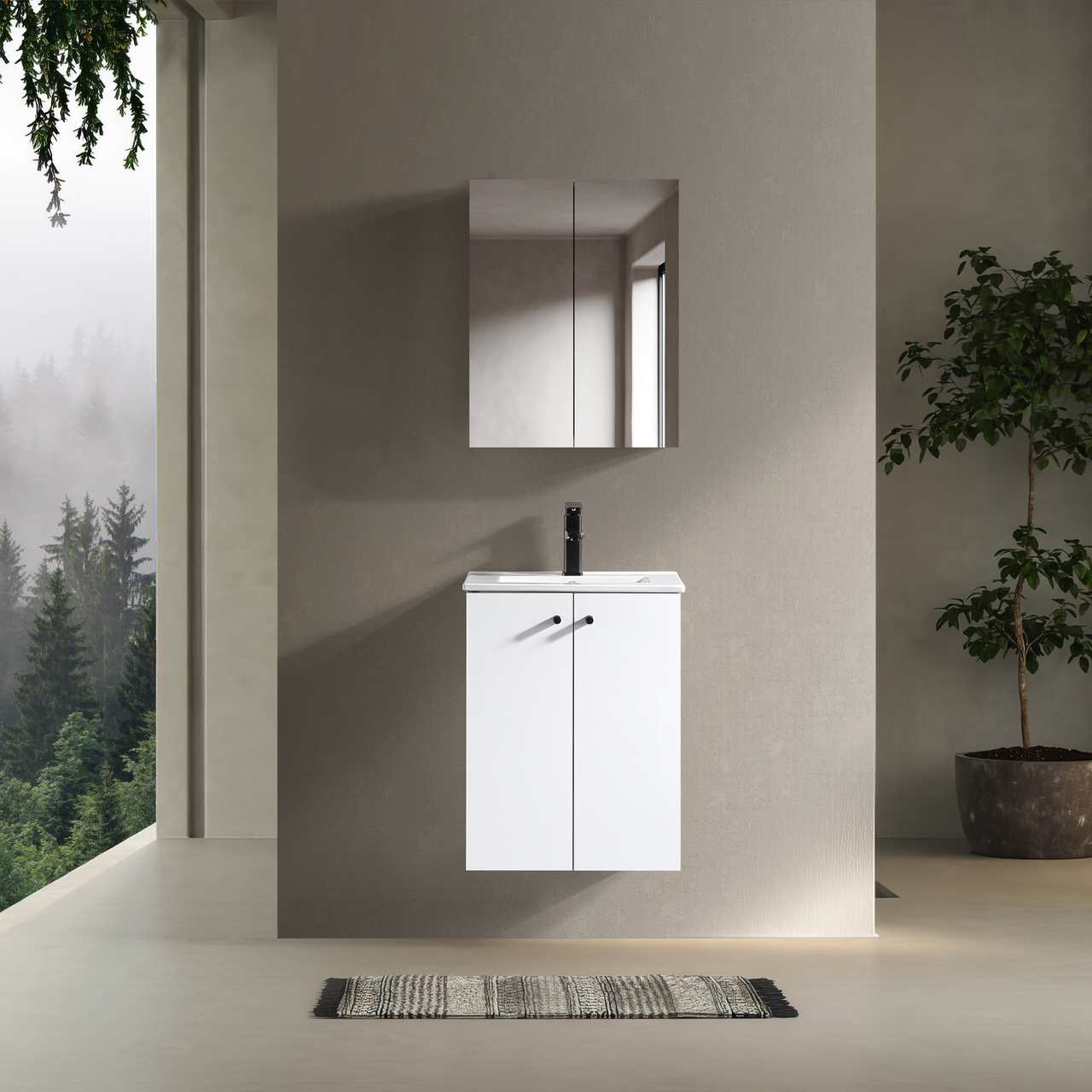 Baderomsmøbelet kommer ferdig montert, med en keramisk servant og et speilskap. Speilskapet har to hyller for praktisk oppbevaring. Skuffene og dørene har en soft close-funksjon som sørger for myk lukking og forlenger levetiden.