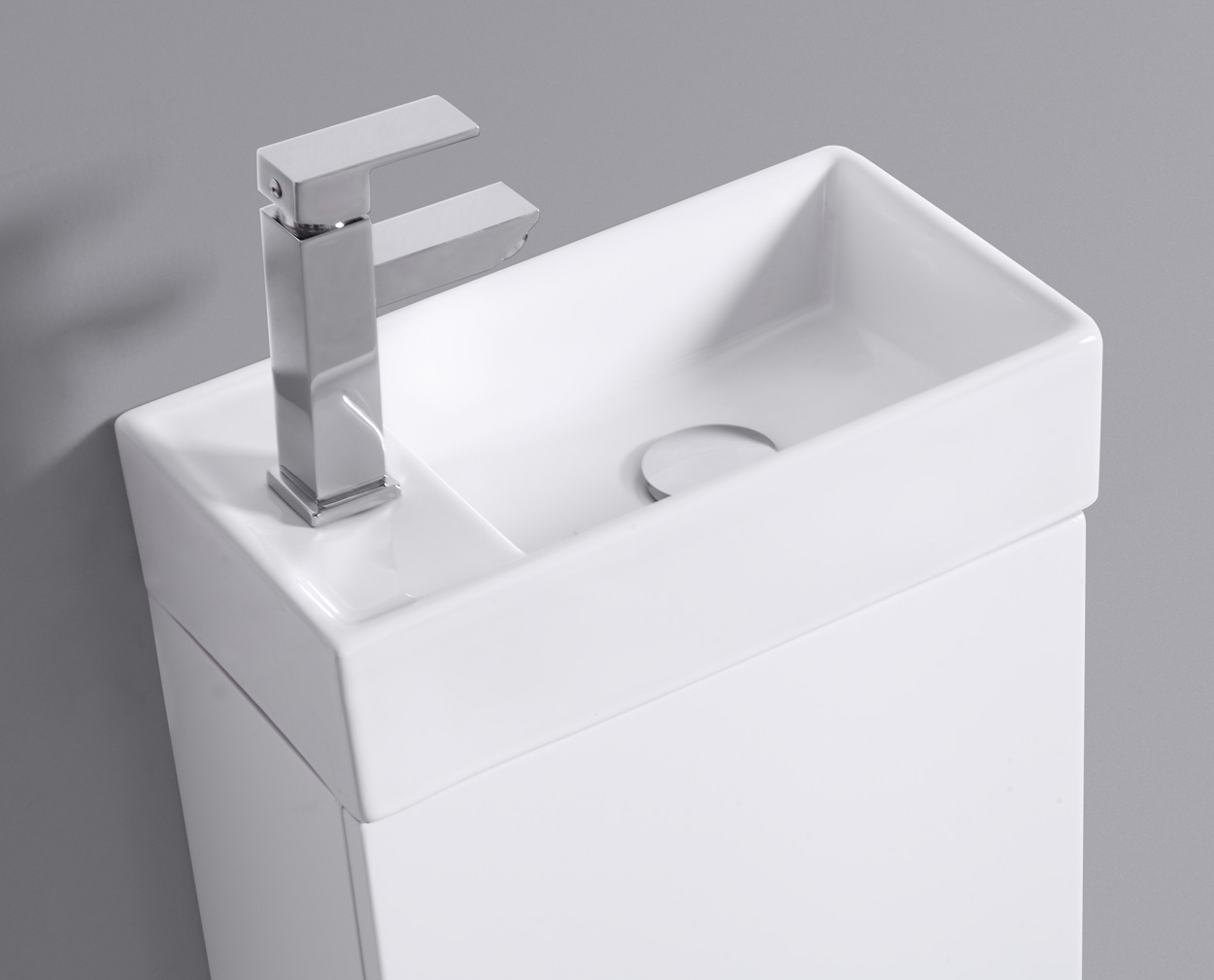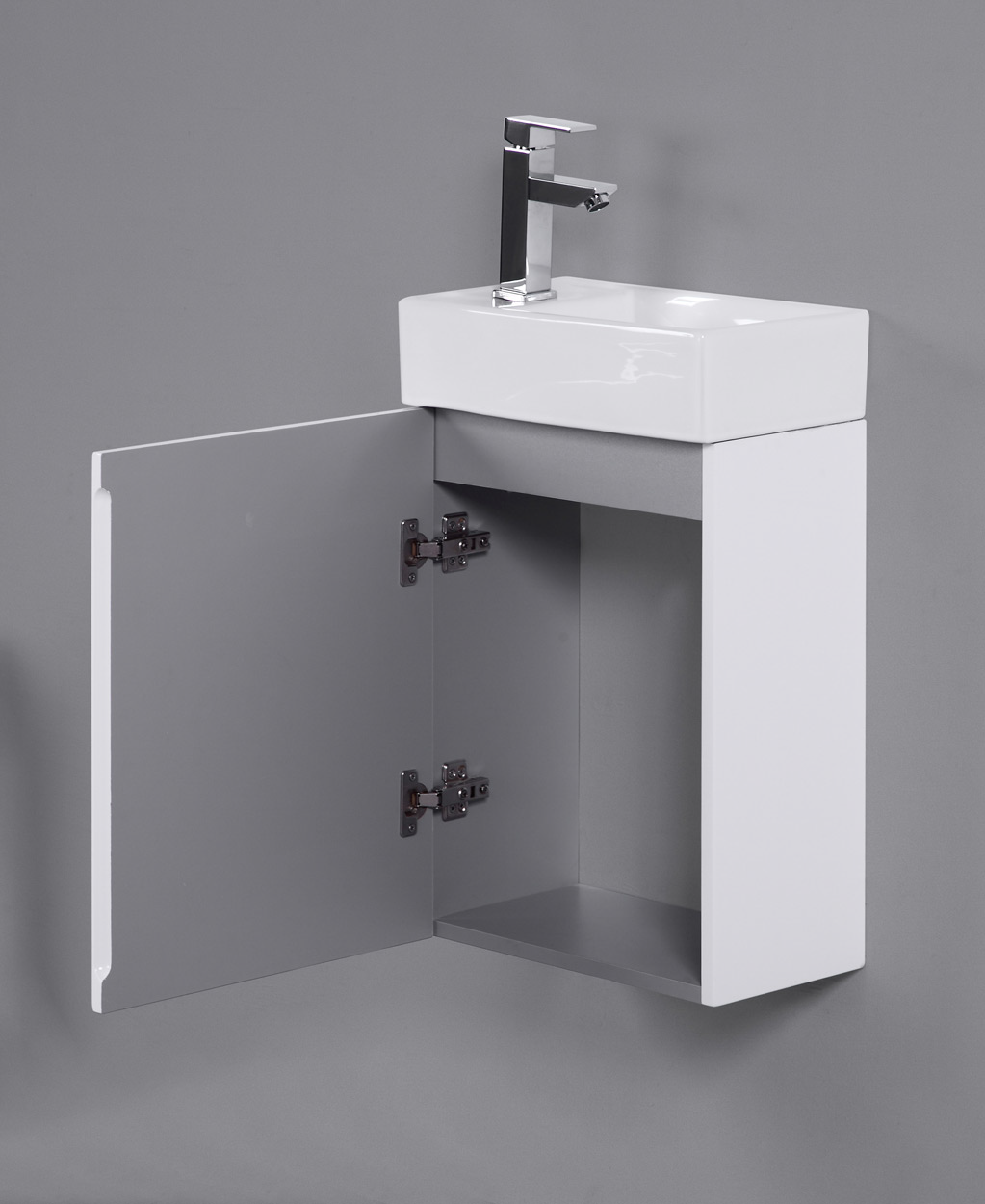 Baderomsmøbelet kommer med en porselensservant som kan vendes, slik at du får armaturen på den siden du selv ønsker. Skapdøren på underskapet kan monteres med hengslene både på høyre og venstre side.