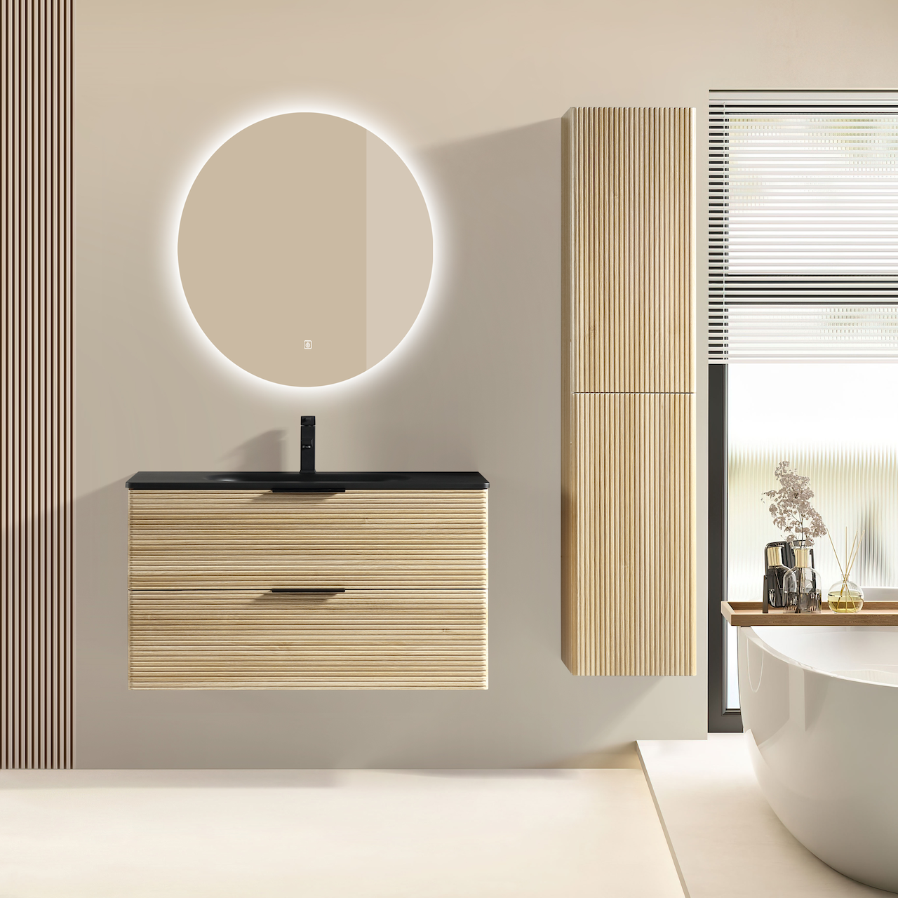 Lind Timber er en moderne møbelserie med en eikefarget overflate. Dette baderomsmøbelet har riller i front, og en foliert overflate. Den folierte overflaten gjør rengjøringen enklere, og bevarer møbelets slitestyrke.