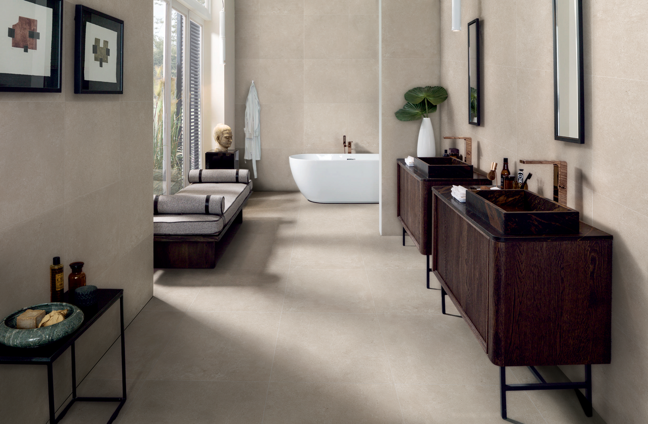 Innovation Lime-serien er slitesterke porcellanatofliser med et moderne design. Denne flisen i størrelse 60 x 60 har en halvmatt overflate med lyse beigetoner.