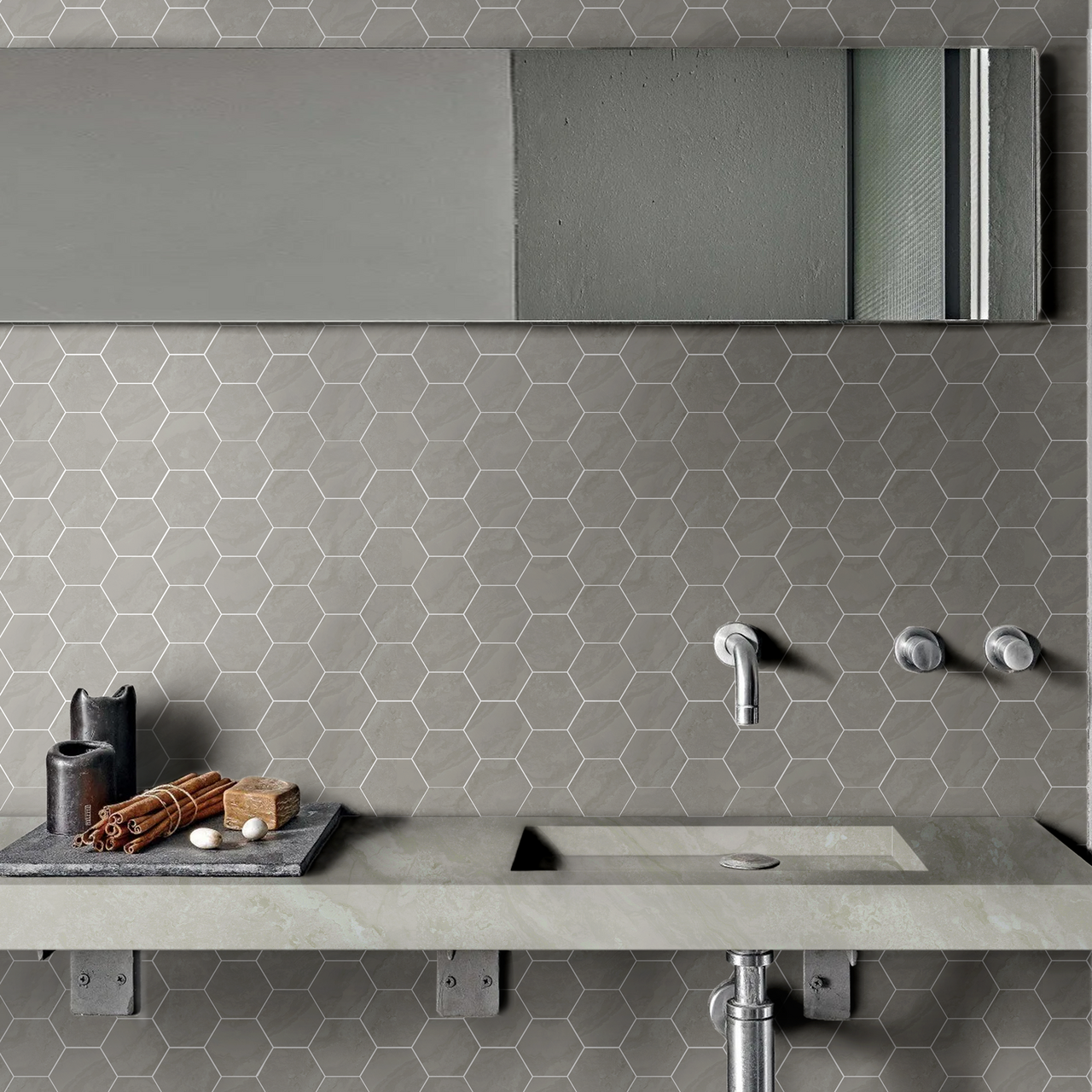 Nuvola er en porcellanatoflis med en finslipt overflate, som bidrar til et naturtro og eksklusivt uttrykk i ethvert hjem. Denne sekskantede flisen har et rolig fargespill av duse gråtoner.