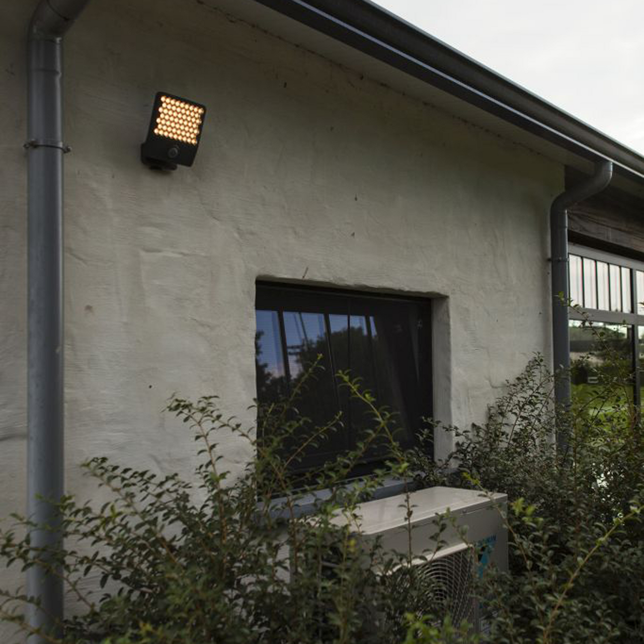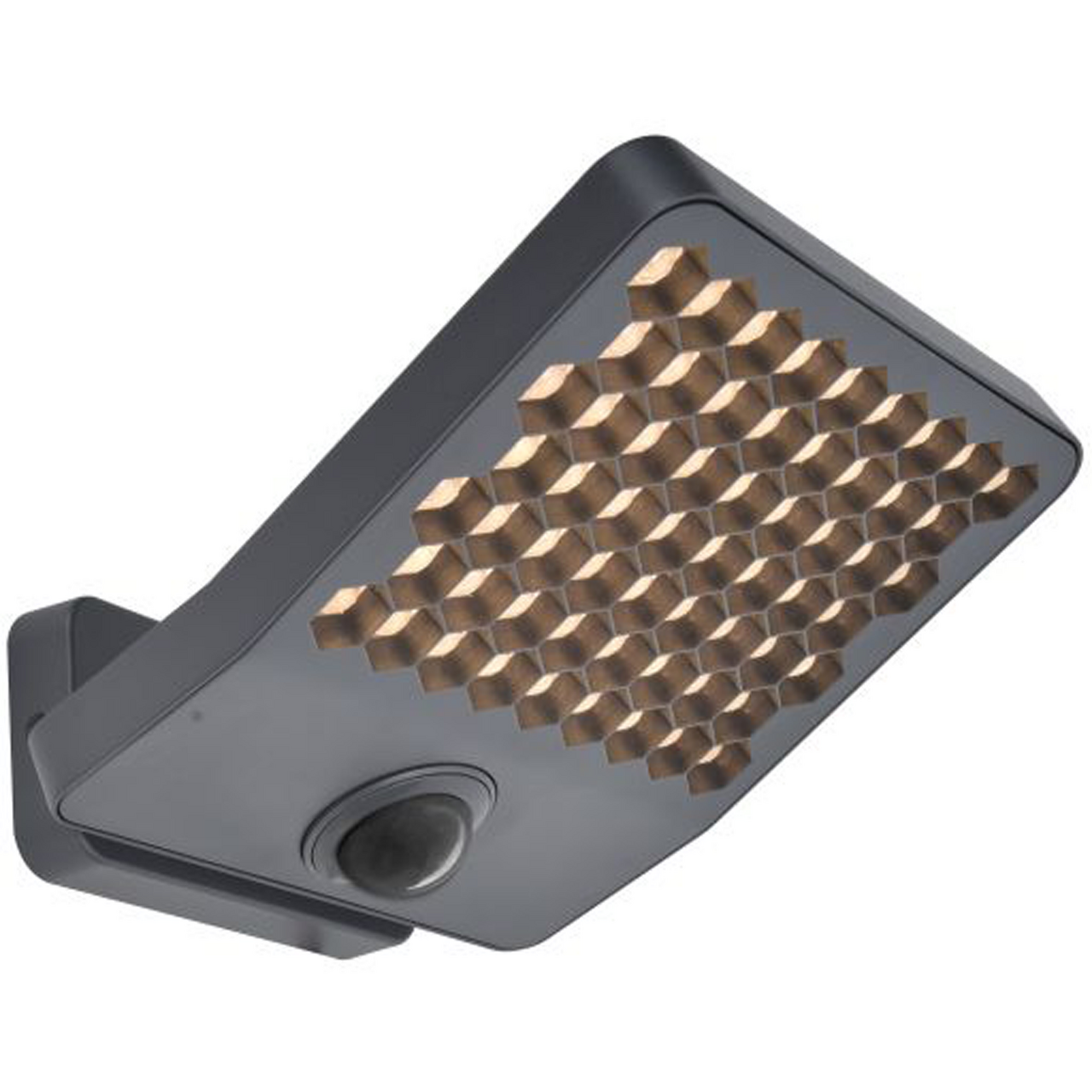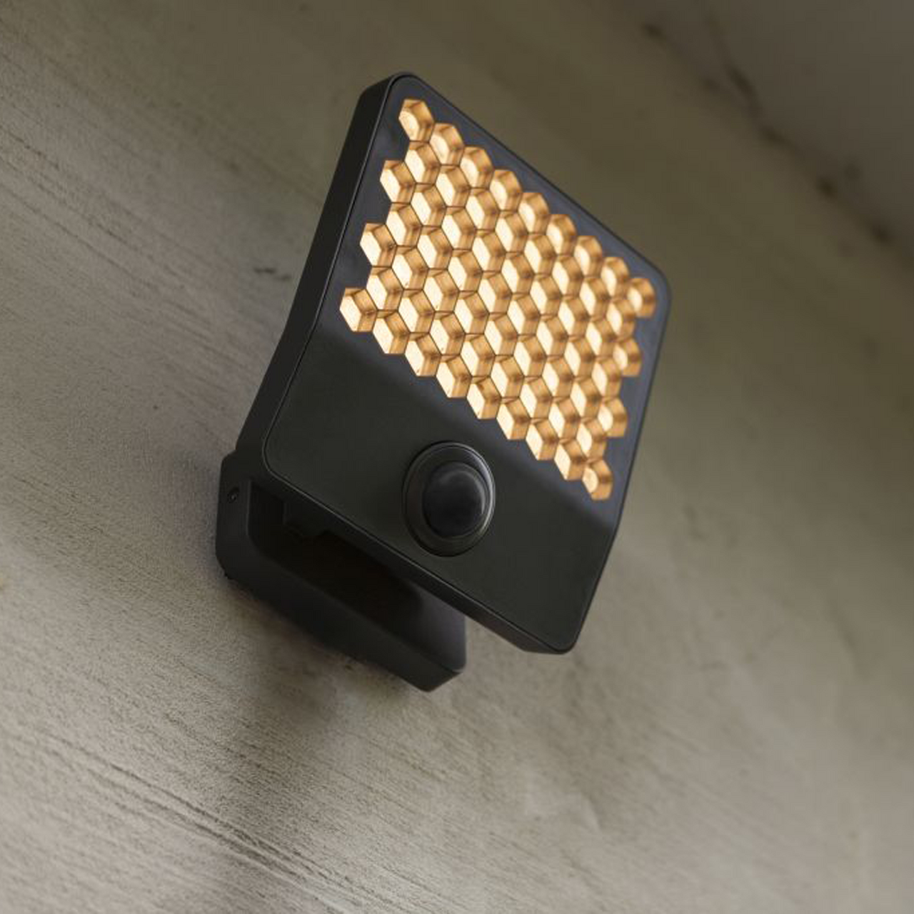 De klare diffusorene i bikakeform sørger for et behagelig lys, mens hodet kan roteres 90° for målrettet belysning. Med en justerbar PIR-sensor som oppdager bevegelse, får du ekstra trygghet rundt huset.
