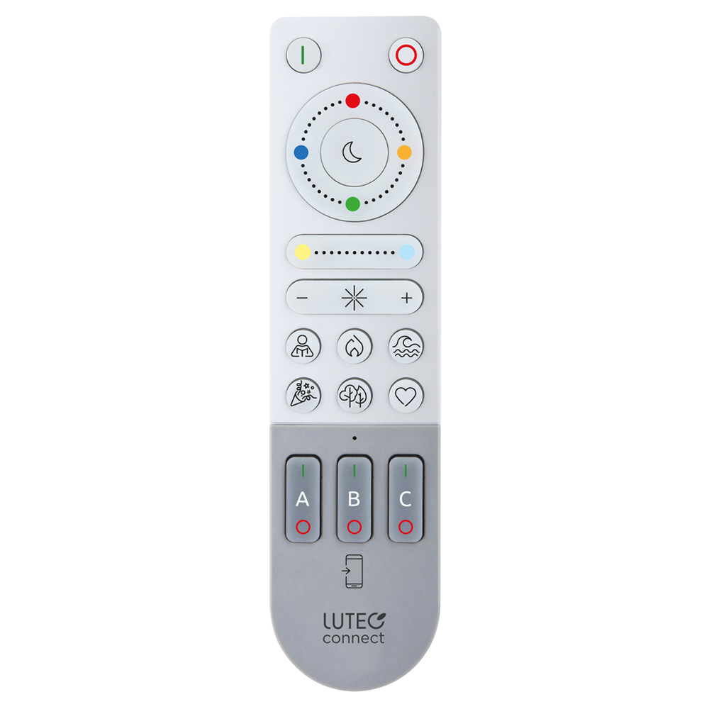 Ved hjelp av fjernkontrollen kan man dimme eller justere fargen på lyset, og velge en scene som for eksempel nattlys. Den kan også legges til i Lutec Connect-appen.