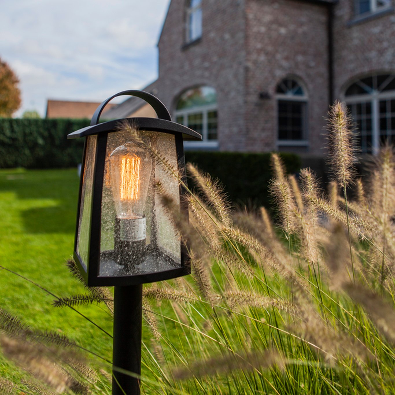Denne lyktestolpen fra Lutec har et moderne design med et klassisk preg, med matt sort ramme og strukturert glass. Den passer godt inn i de fleste uterom.