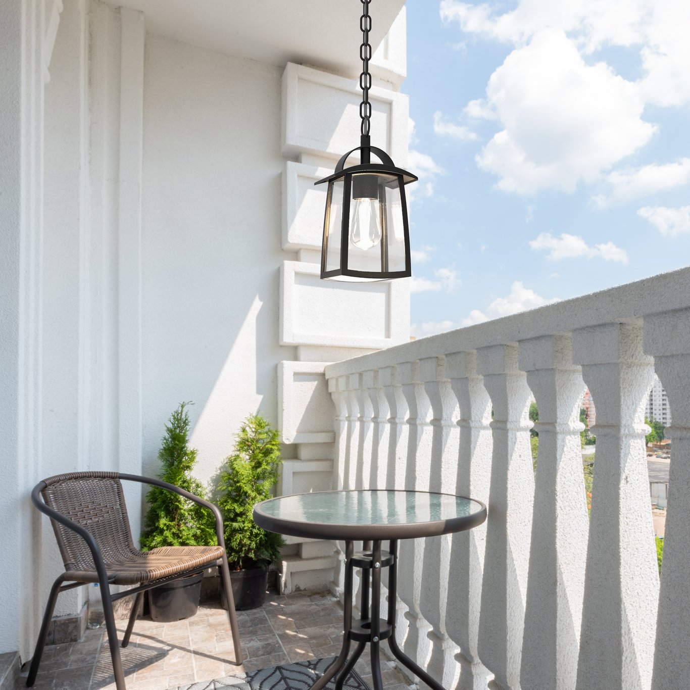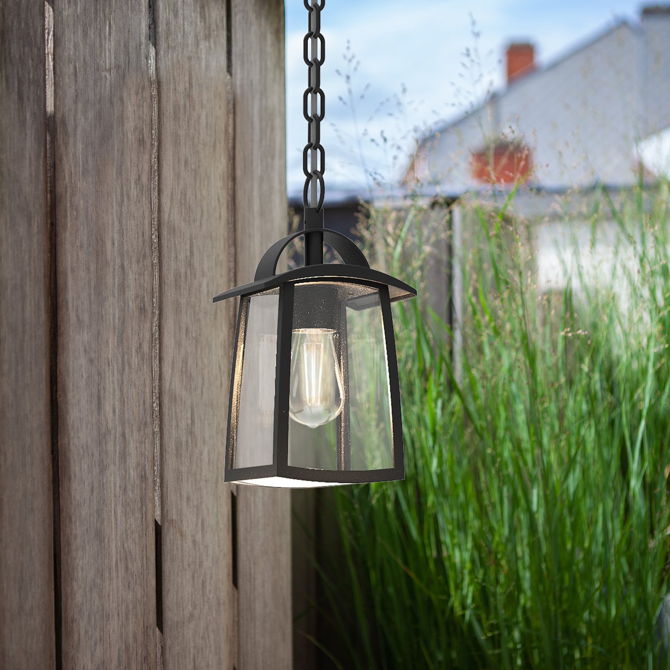 Denne utendørs pendellampen fra Lutec har et moderne design med et klassisk preg, med matt sort ramme og klart glass. Den passer godt inn i de fleste uterom.