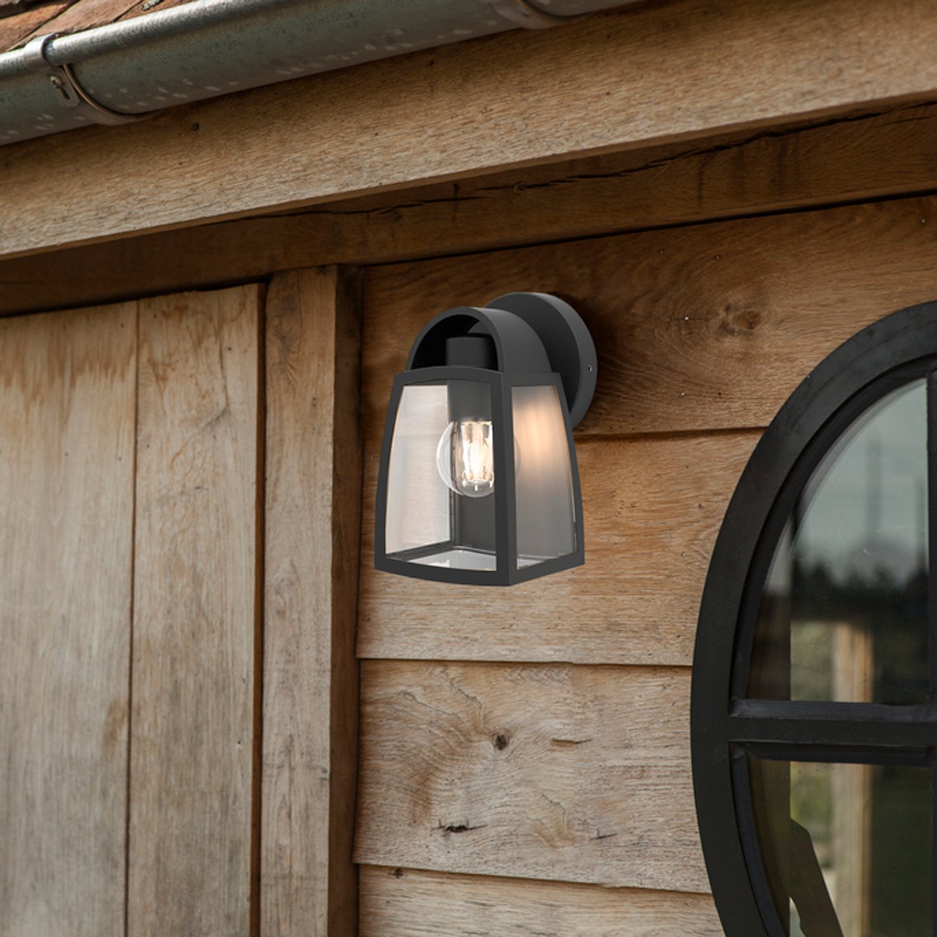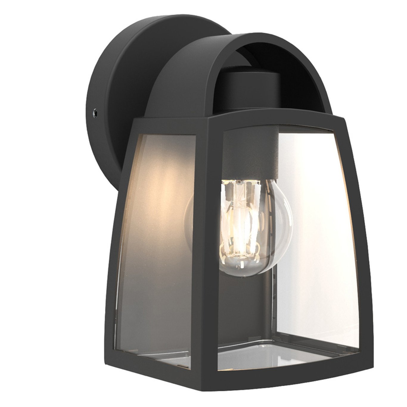 Denne utendørs vegglampen fra Lutec har et moderne design med et klassisk preg, med matt sort ramme og klart glass. Den passer godt inn i de fleste uterom.