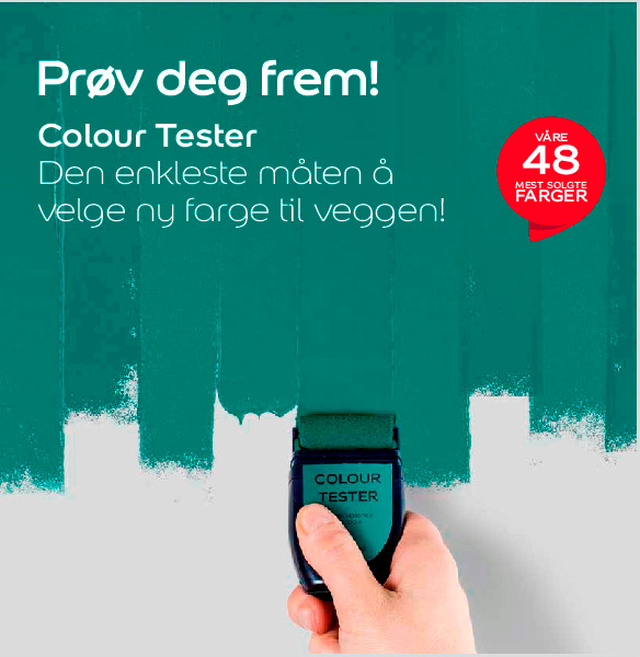 Nordsjö Colour tester er en vannbasert maling for fargeprøving på vegg og tak. Den innebygde minirullen gjør det enkelt og hurtig å gjøre en fargetest på stedet du ønsker å male om. Ved ommaling eller nymaling av innvendige veggflater vil Colour testeren gjøre det enklere å velge riktig farge.