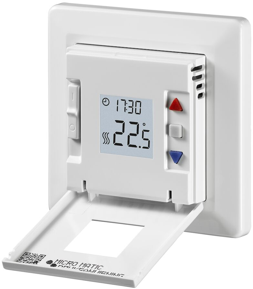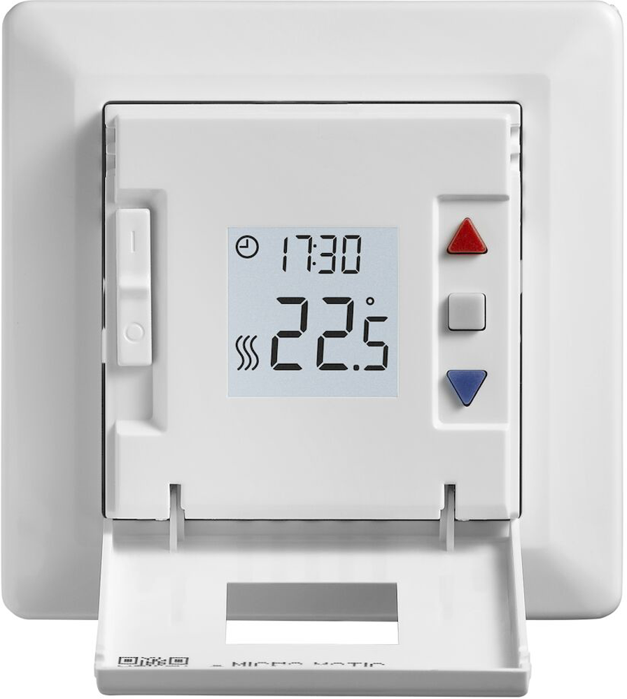 Denne urtermostaten fra Micromatic kommer med åpent-vindu funksjon, lærefunksjon og inngang for eksternt styresignal. Den har også innebygget regulatorfunksjon og dobbelt følersystem for beskyttelse av tregulv.